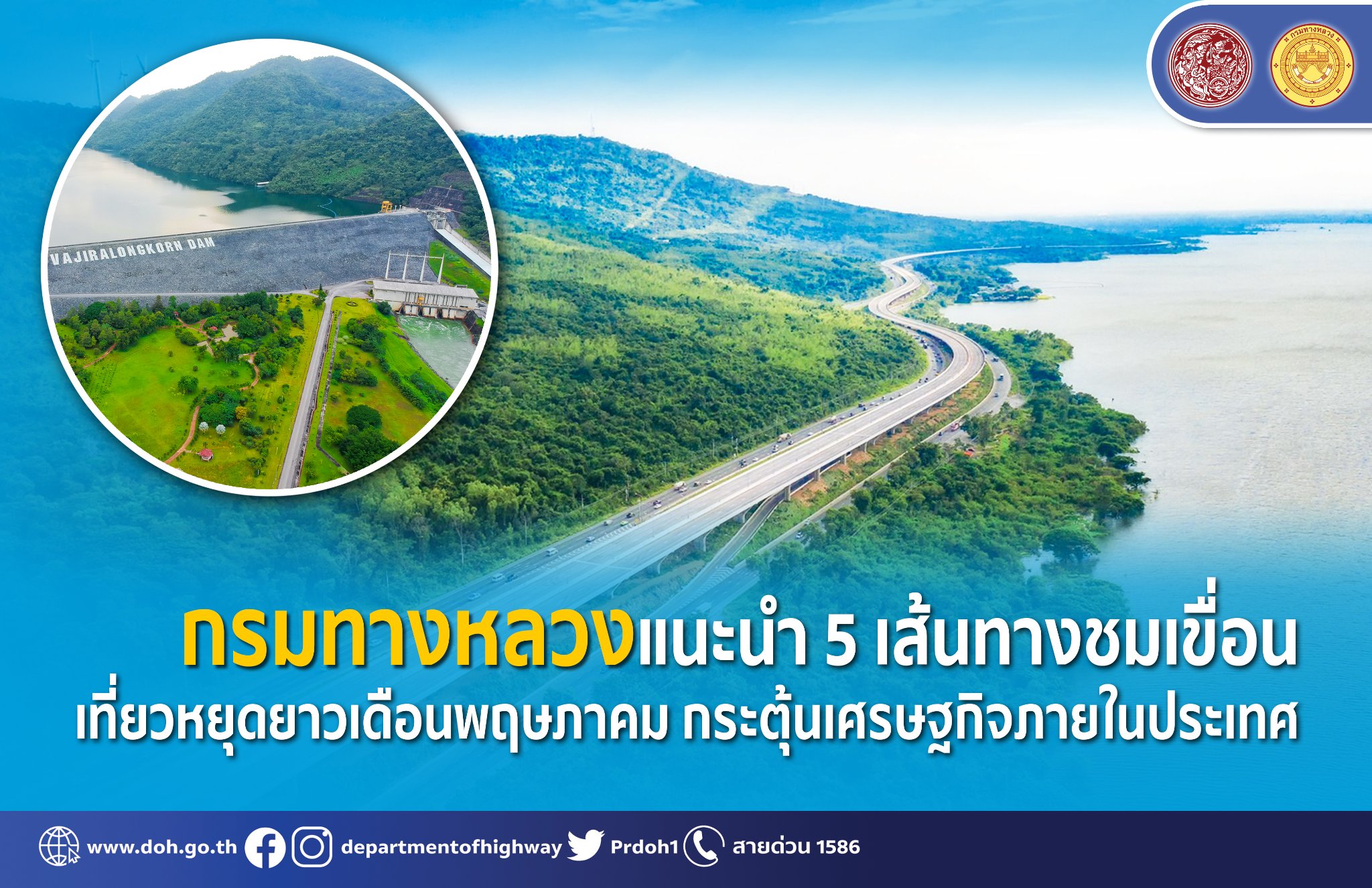 กรมทางหลวงแนะนำ 5 เส้นทางชมเขื่อน เที่ยวหยุดยาวเดือนพฤษภาคม กระตุ้นเศรษฐกิจภายในประเทศ