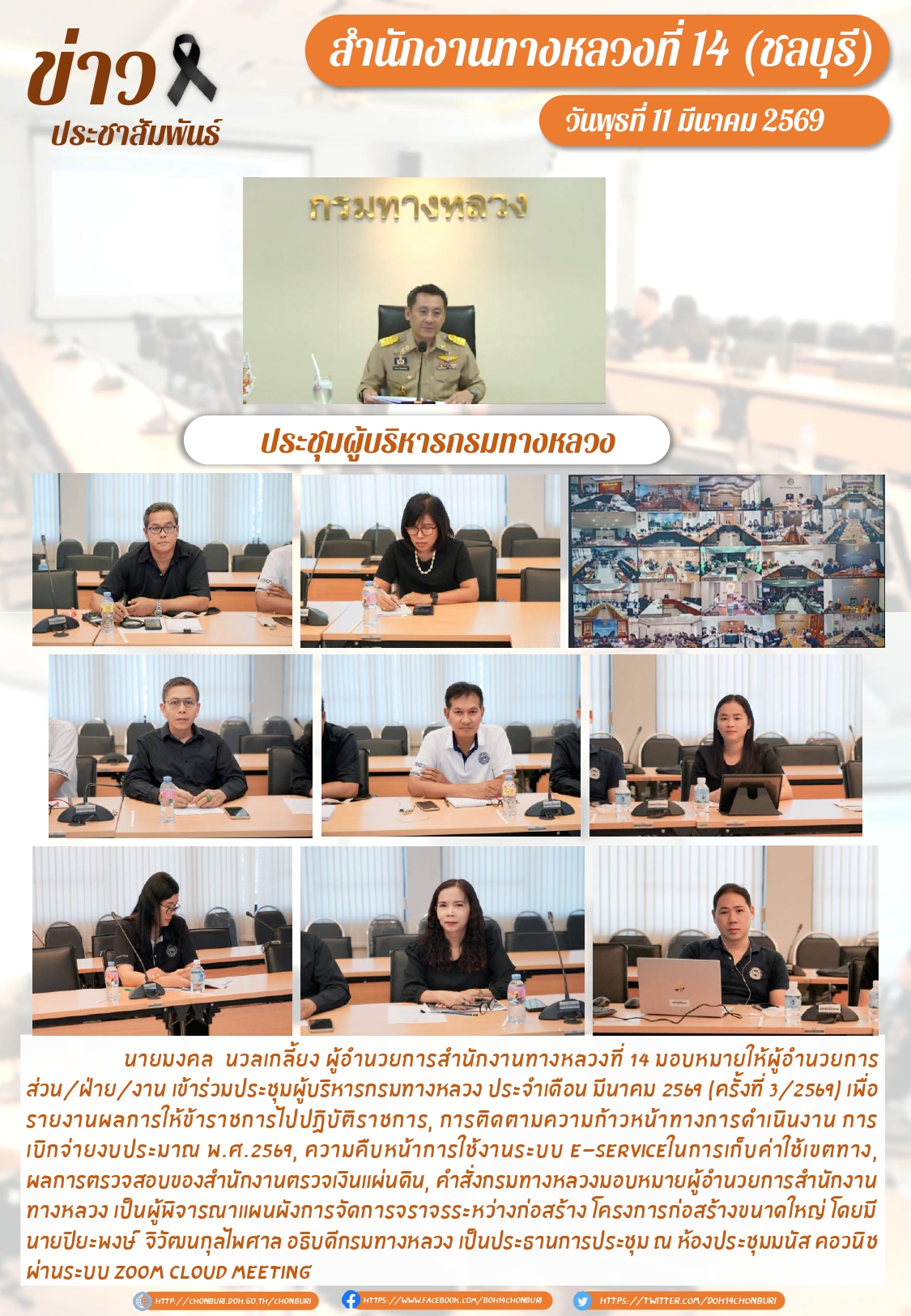 มอบหมายให้ผู้อำนวยการส่วน/ฝ่าย/งาน เข้าร่วมประชุมผู้บริหารกรมทางหลวงประจำเดือน มีนาคม 2569 (ครั้งที่ 3/2569)
