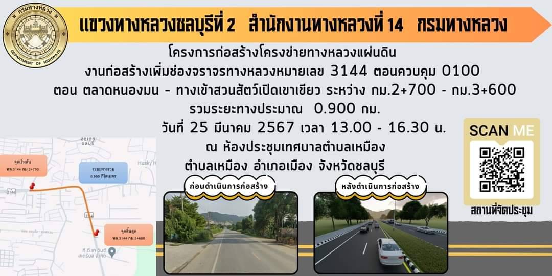 โครงการประชาชนมีส่วนร่วม โครงการก่อสร้างเพิ่มประสิทธิภาพทางหลวง งานก่อสร้างเพิ่มช่องจราจร ทางหลวงหมายเลข ๓๑๔๔ ตอน ตลาดหนองมน - ทางเข้าสวนสัตว์เปิดเขาเขียว