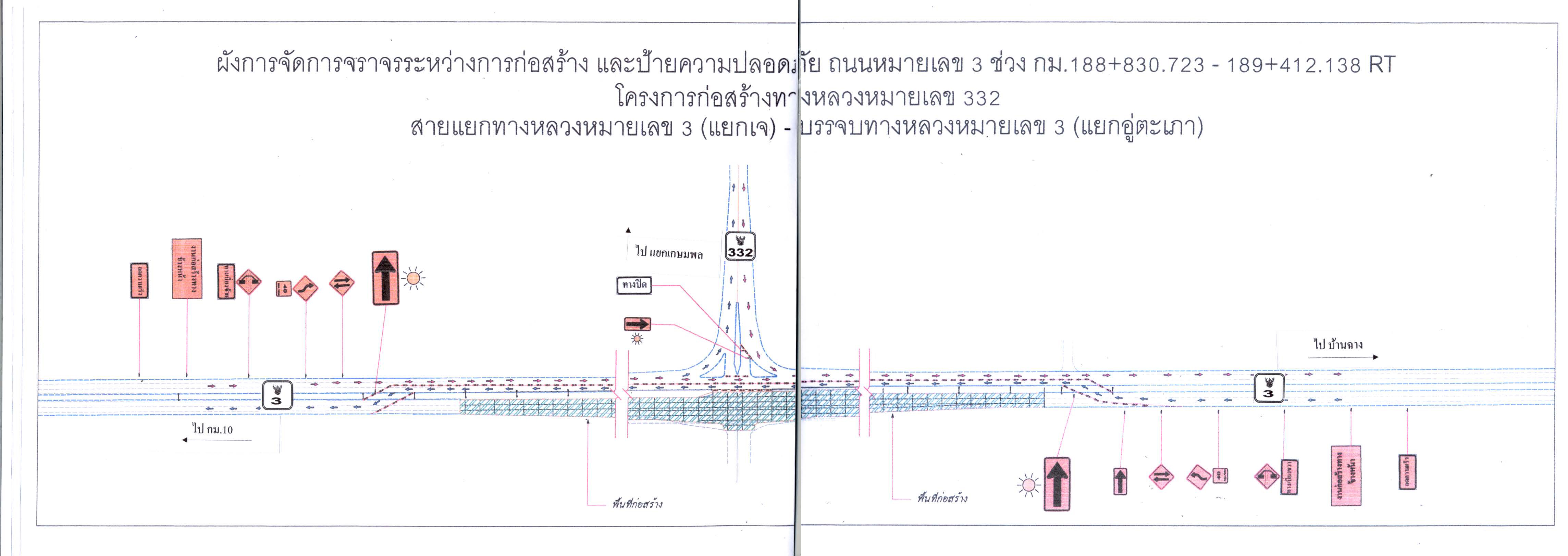 ประชาสัมพันธ์ เบี่ยงการจราจรระหว่างก่อสร้าง และป้ายความปลอดภัย ถนนหมายเลข 3 ช่วง กม.188+830.723 - 189+412.138 RT โครงการก่อสร้างทางหลวงหมายเลข 332 สายแยกทางหลวงหมายเลข 3 (แยกเจ) - บรรจบทางหลวงหมายเลข 3 (แยกอู่่ตะเภา)