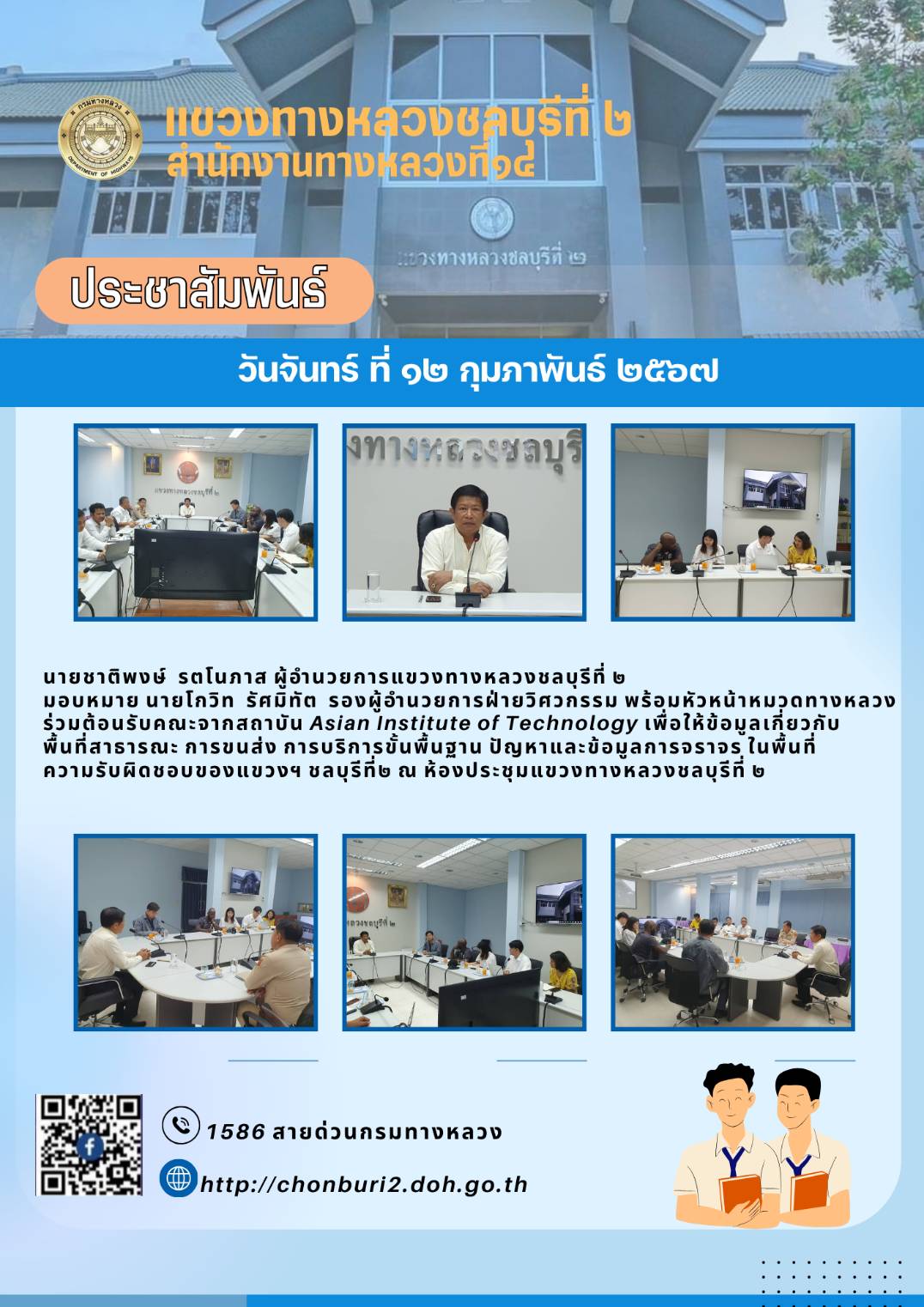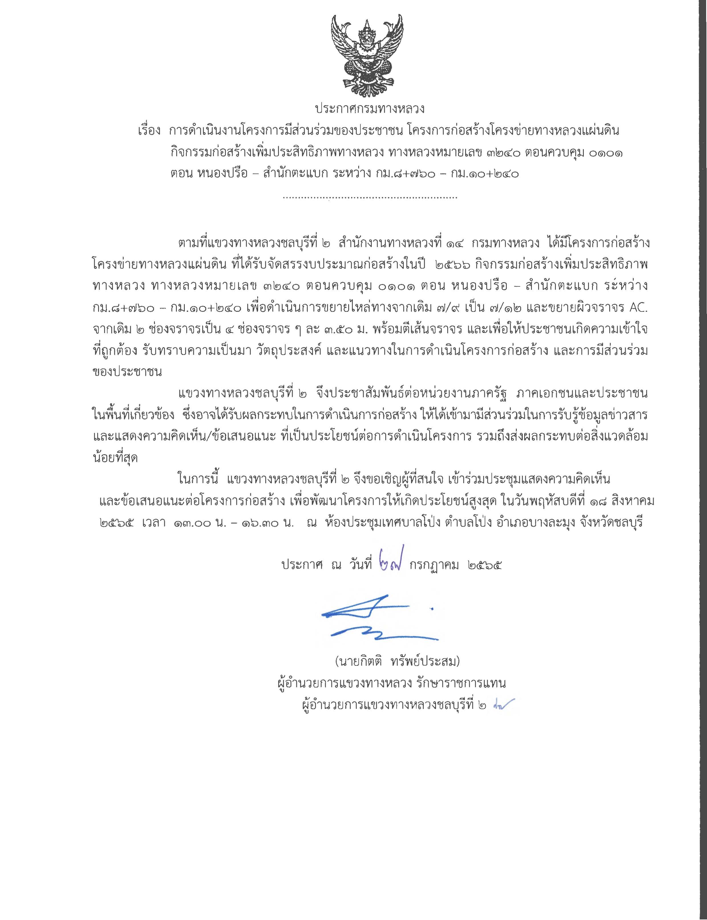 "ขอเชิญชวน รับฟังการดำเนินงานโครงการมีส่วนร่วมของประชาชน โครงการก่อสร้างโครงข่ายทางหลวงแผ่นดินกิจกรรมก่อสร้างเพิ่มประสิทธิภาพทางหลวง ทางหลวงหมายเลข 3240 ตอนควบคุม 0101 ตอน หนองปรือ - สำนั้กตะแบก ระหว่าง กม.8+760 - กม.10+240 ในวันพฤหัสบดีที่ 18 สิงหาคม 2565 เวลา 13.00 - 16.30 น. ณ ห้องประชุมเทศบาลโป่ง ตำบลโป่ง อำเภอบางละมุง จังหวัดชลบุรี