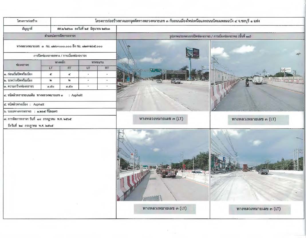 แผนผังการจัดจราจร โครงการก่อสร้างทางแยกจุดตัดทางหลวงหมายเลข 3 กับถนนเมืองใหม่เหนือและถนนนิคมแหลทฉบัง 4 จ.ชลบุรี 1 แห่ง ระหว่าง กม.126+000.000 ถึง กม.127+265.000 รวมระยะทาง 1.265 กิโลเมตร ตั้งแต่วันที่ 18 - 24 กรกฎาคม 2565 ในระหว่างดำเนินการอาจทำให้ไม่ได้รับความสะดวก แขวงทางหลวงชลบุรีที่ 2 ต้องขออภัย ณ โอกาสนี้ และขอให้ประชาชนใช้เส้นทางอย่างระมัดระวัง หรือหลีกเลี่ยงการใช้เส้นทางปฏิบัติตามป้ายเตือน ป้ายแนะนำทางเลี่ยง ป้ายเสริมจากโครงการ และสัญญาณจราจรที่ติดตั้ง เพื่อประโยชน์ต่อการเดินทาง