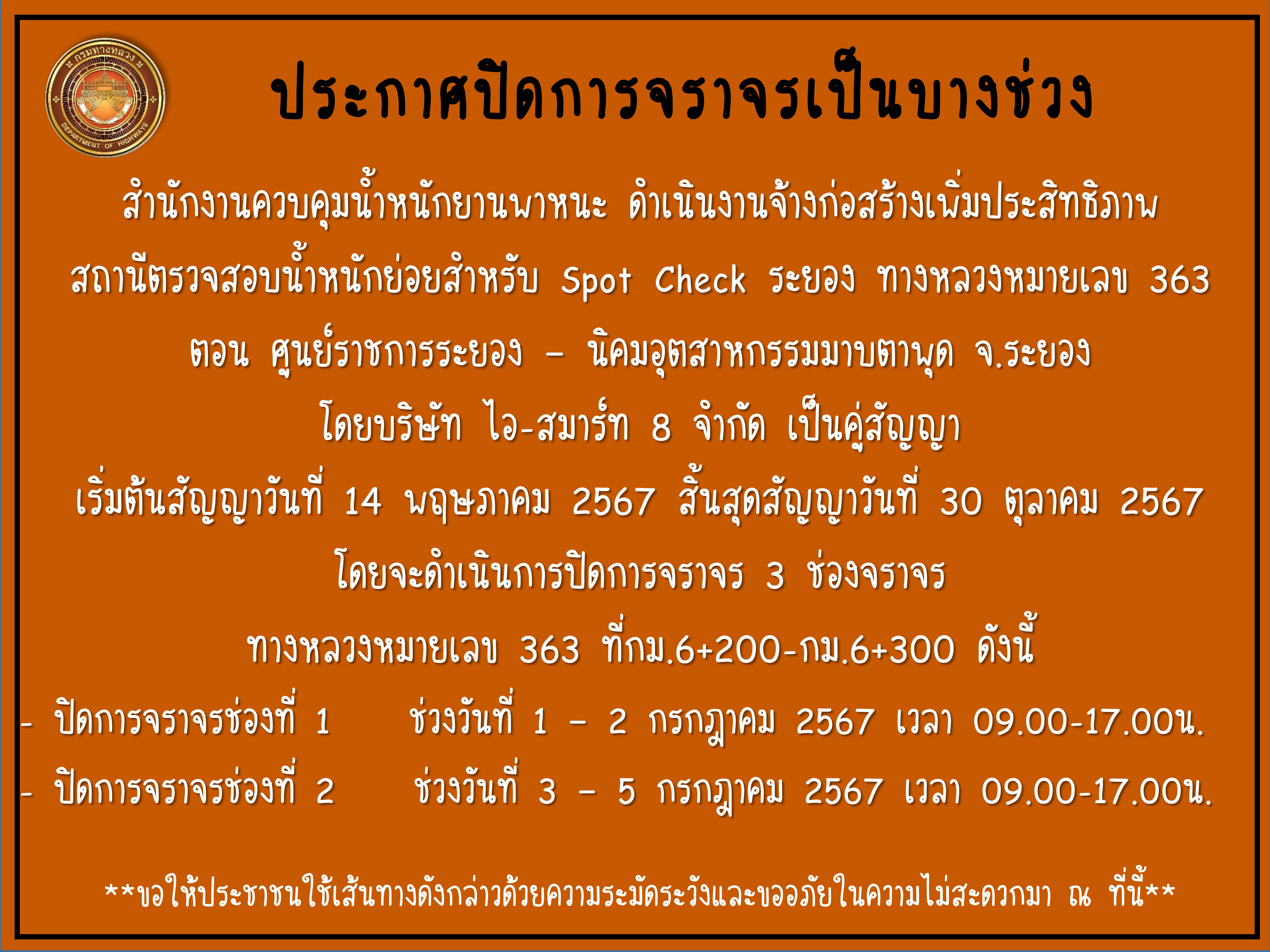 แจ้งปิดการจราจรเป็นบางช่วงระหว่างการก่อสร้าง ทางหลวงหมายเลข 363 ตอน ศูนย์ราชการระยอง - นิคมอุตสาหกรรมมาบตาพุด จ.ระยอง