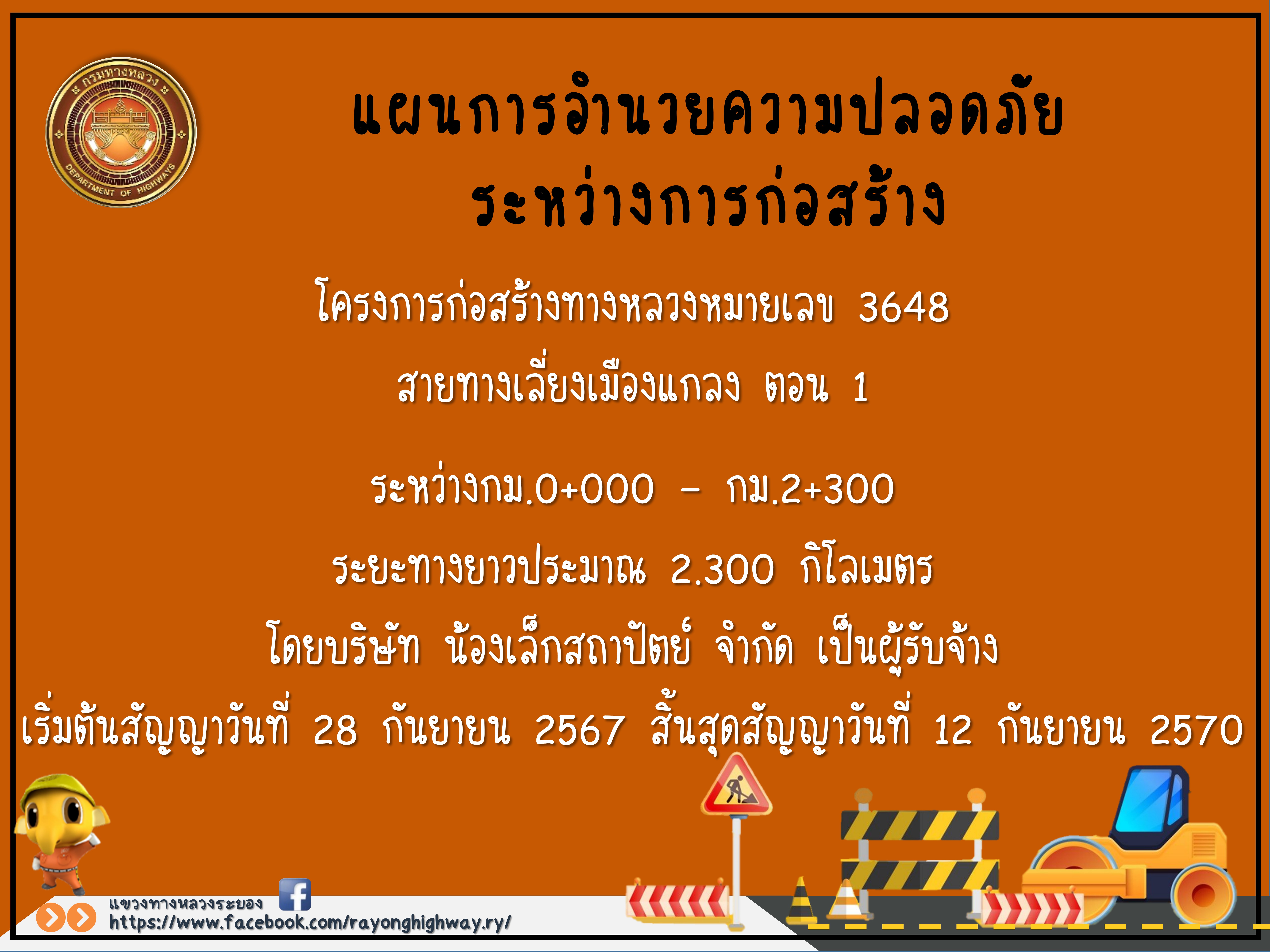 โครงการก่อสร้างทางหลวงหมายเลข 3648 สายทางเลี่ยงเมืองแกลง ตอน 1 ระหว่าง กม.0+000.000-กม.2+300.000 ระยะทางยาวประมาณ 2.300 กิโลเมตร รวมงานติดตั้งไฟฟ้าแสงสว่างและไฟกระพริบบนทางหลวง เริ่มต้นสัญญาวันที่ 28 กันยายน 2567 สิ้นสุดสัญญา วันที่ 12 กันยายน 2570