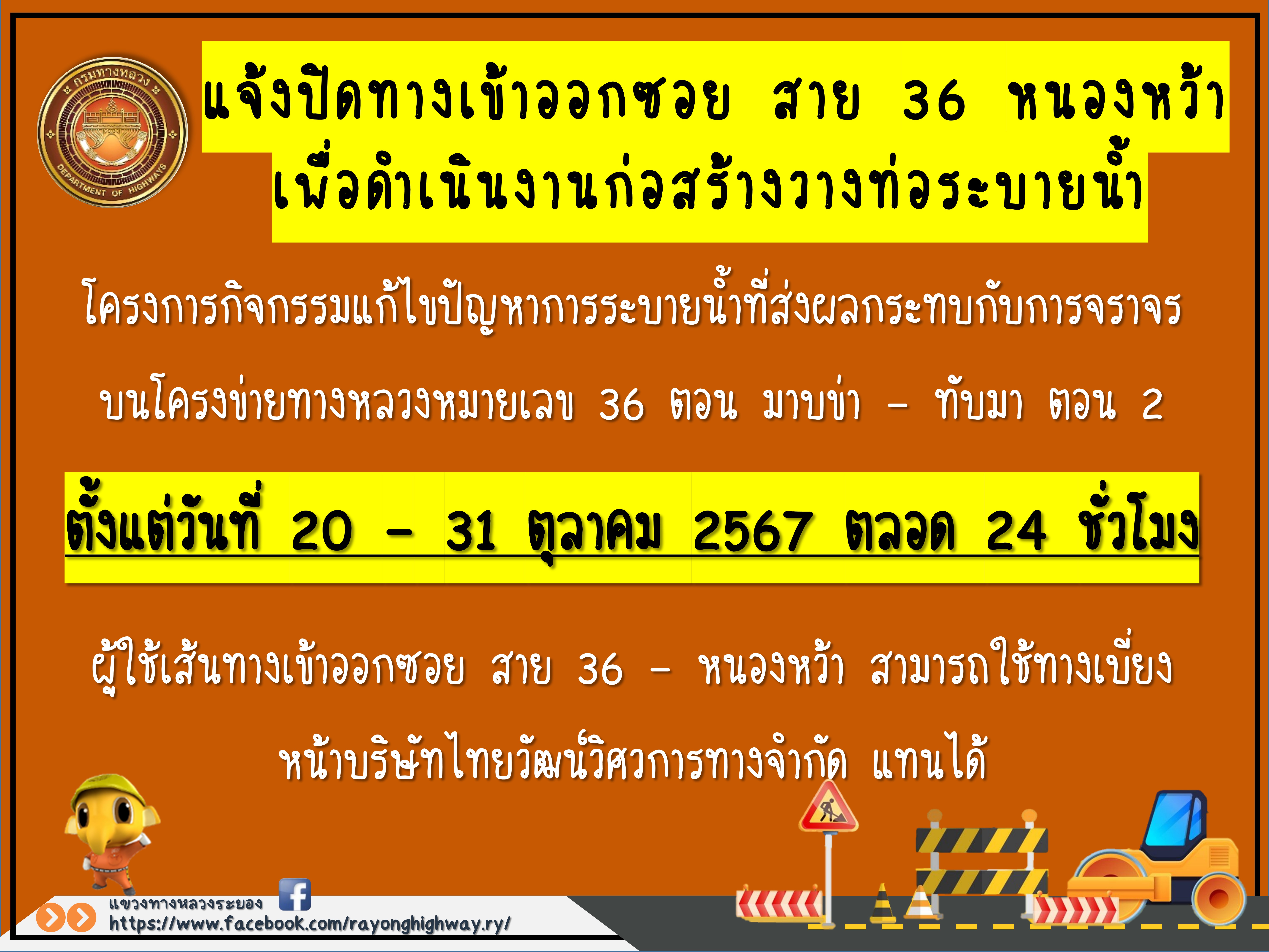 แจ้งปิดทางเข้าออกซอย สาย36 -หนองหว้า เพื่อดำเนินงานก่อสร้างวางท่อระบายน้ำ ตั้งแต่วันที่ 20-31 ตุลาคม 2567 ตลอด 24 ชม.