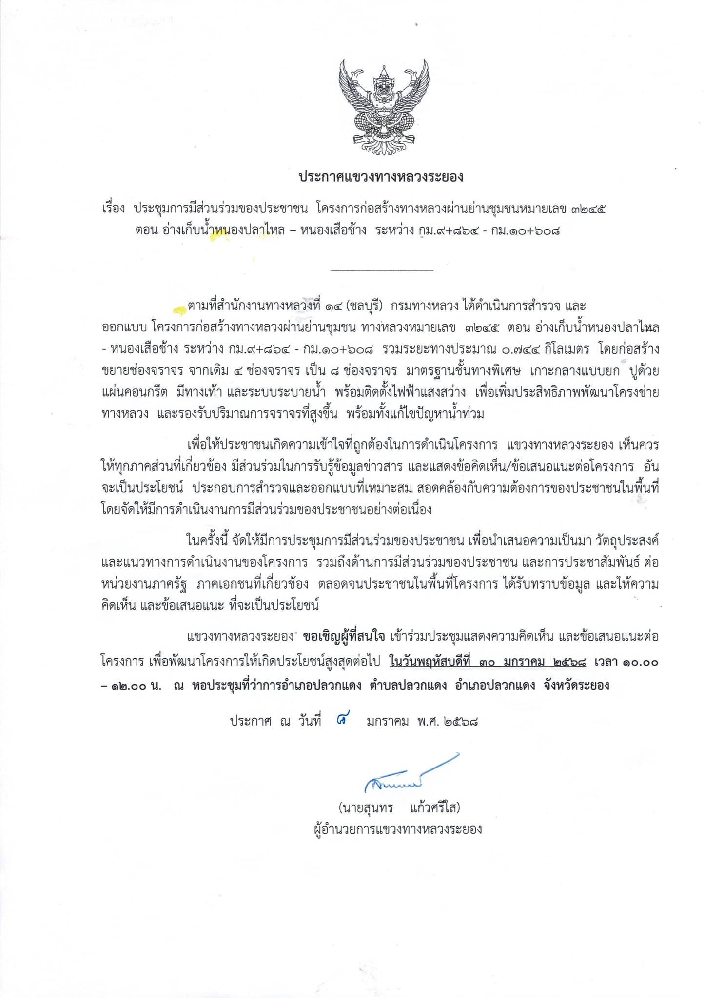 การประชุมการมีส่วนร่วมของประชาชน โครงการก่อสร้างทางหลวงหมายเลข 3 ระยอง-เพ ระหว่าง กม.225+380 - กม.239+250