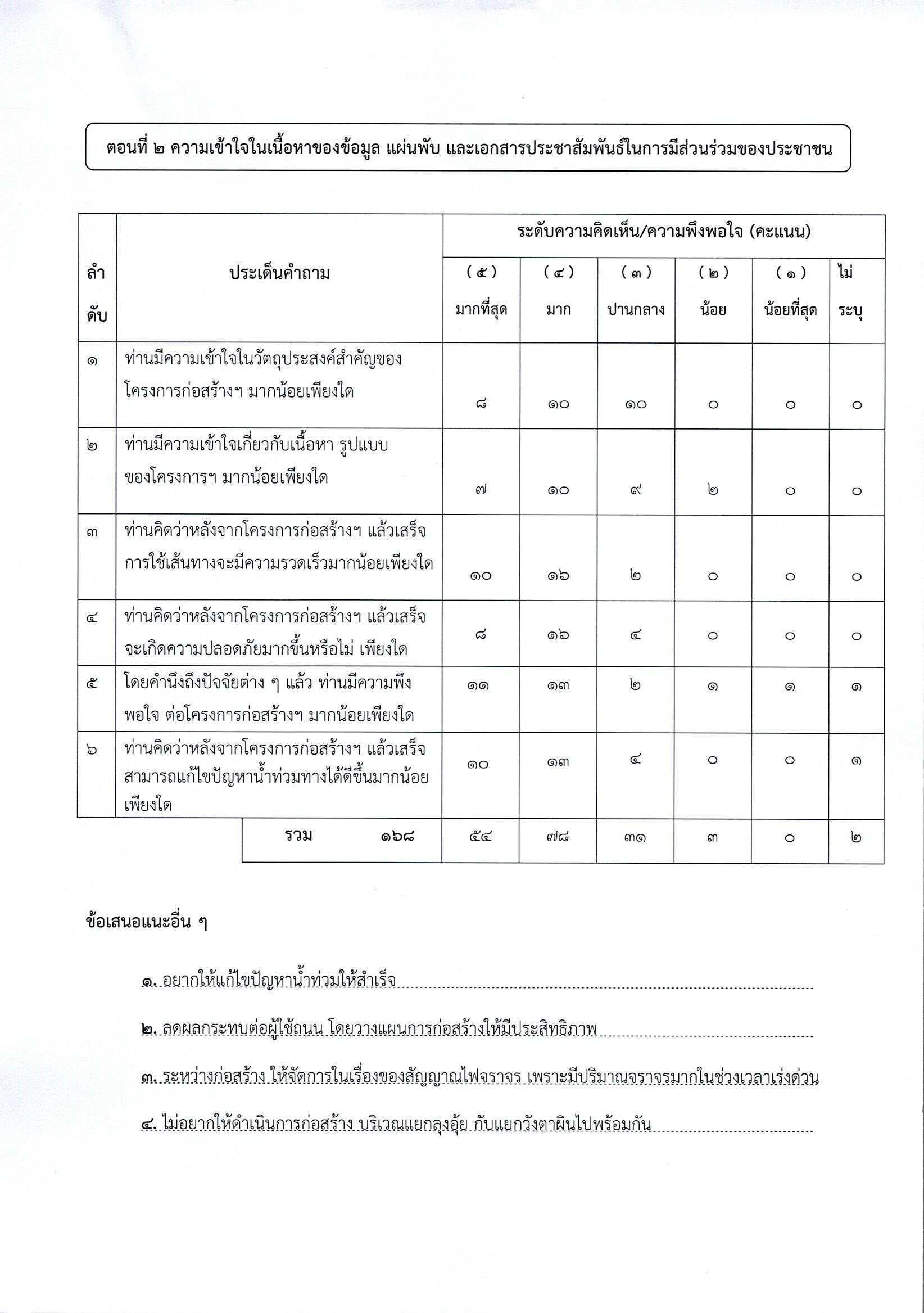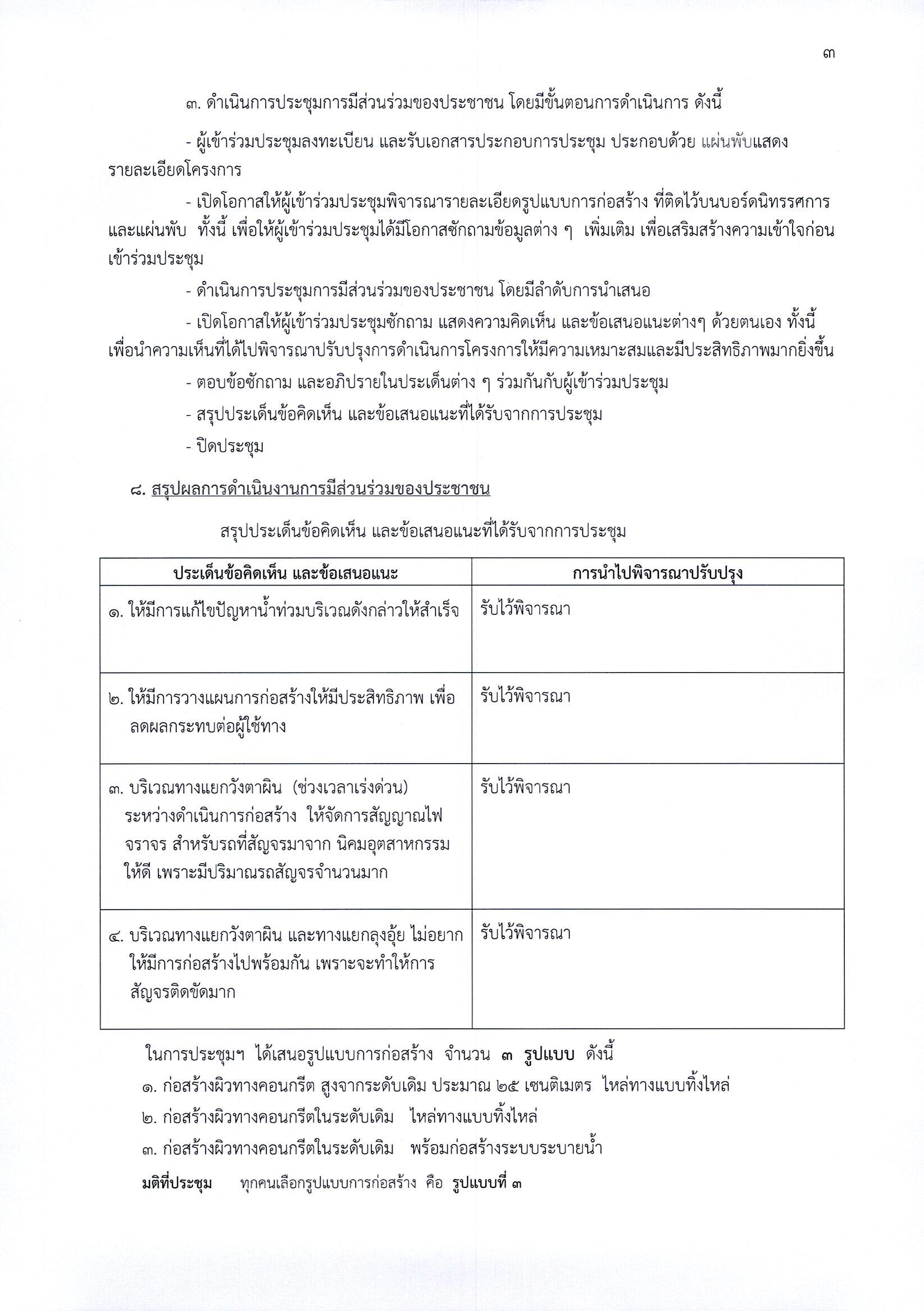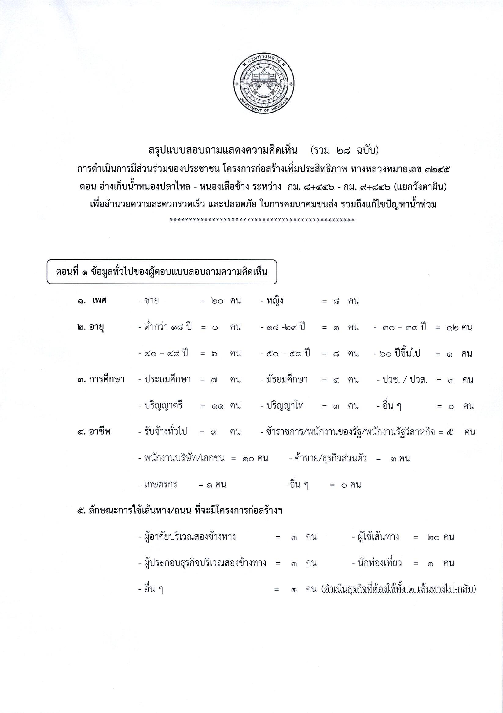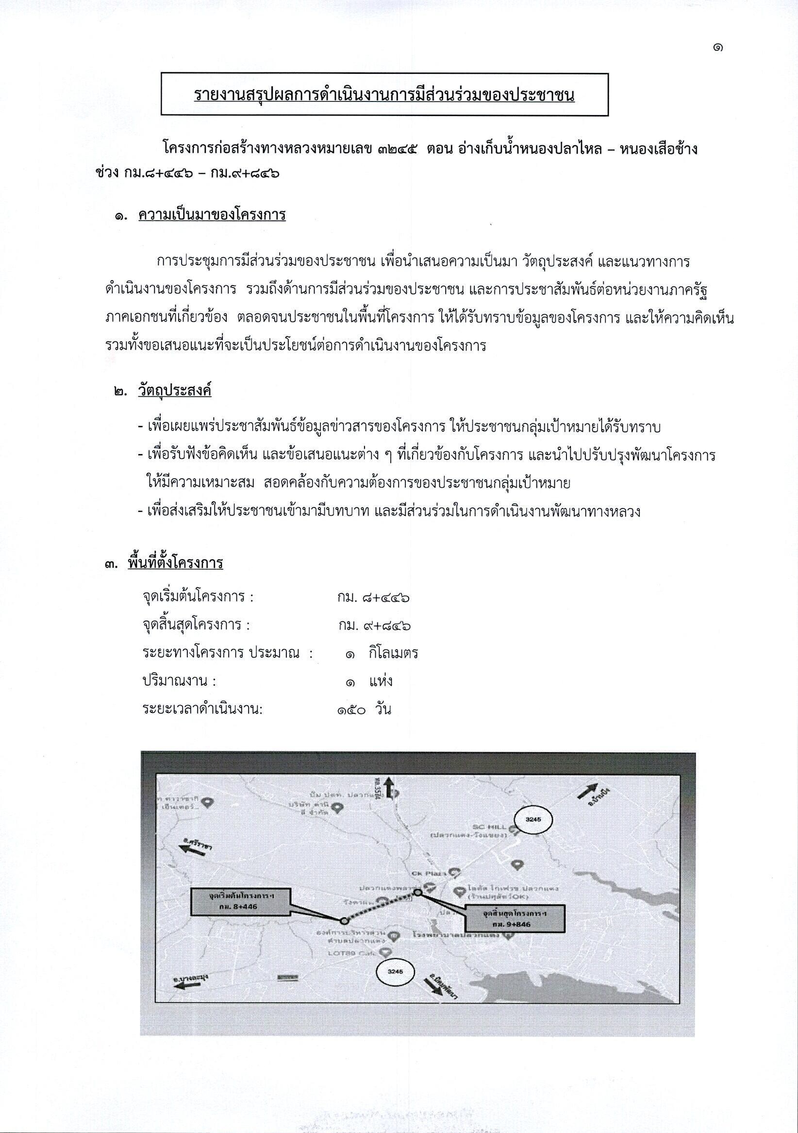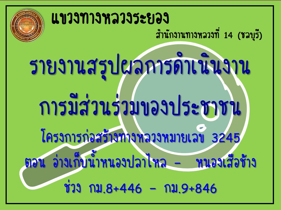รายงานสรุปผลการดำเนินงานการมีส่วนร่วมของประชาชน โครงการก่อสร้างทางหลวงหมายเลข 3245 ตอน อ่างเก็บน้ำหนองปลาไหล - หนองเสือช้าง ช่วง กม.8+446 - กม.9+846