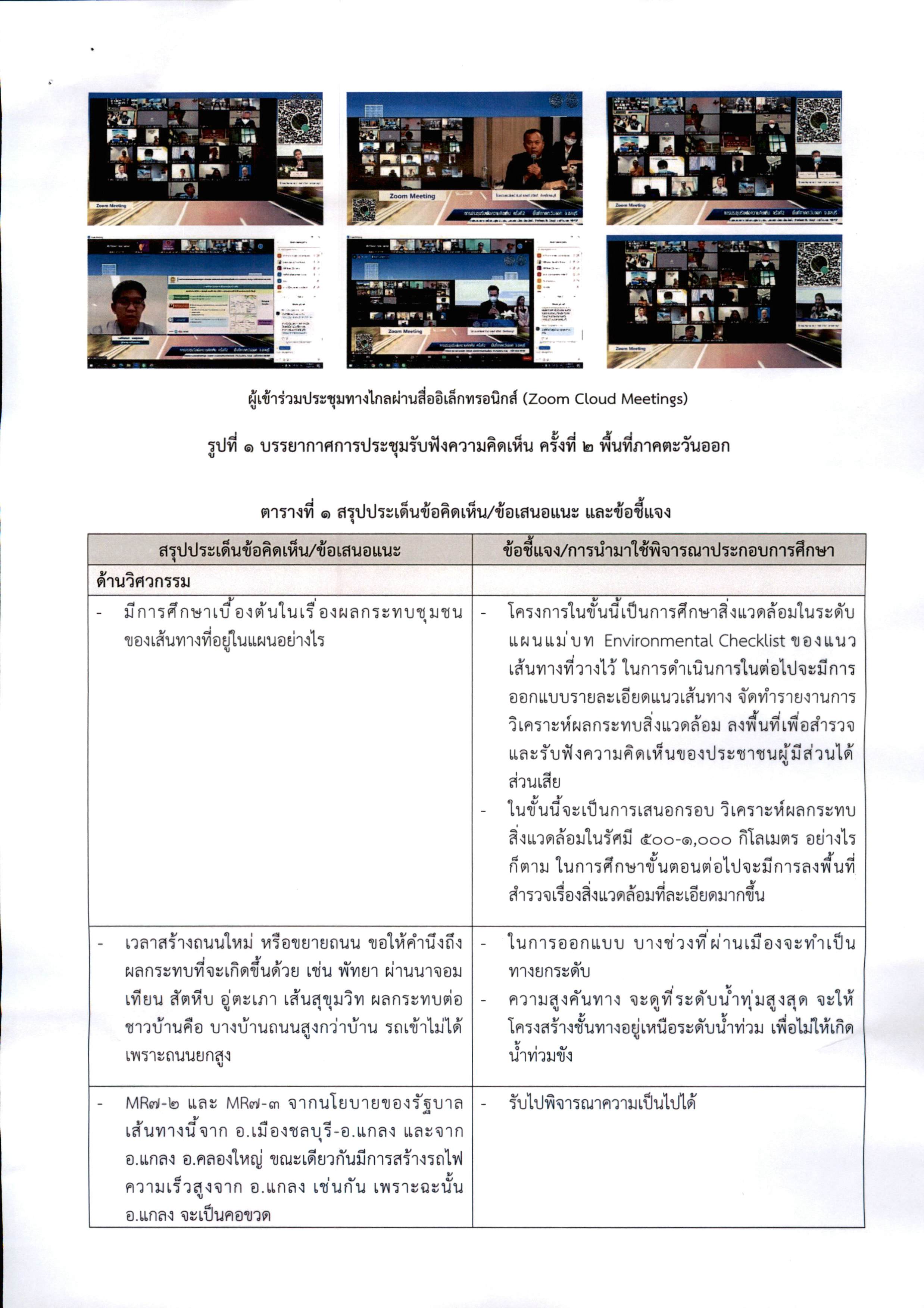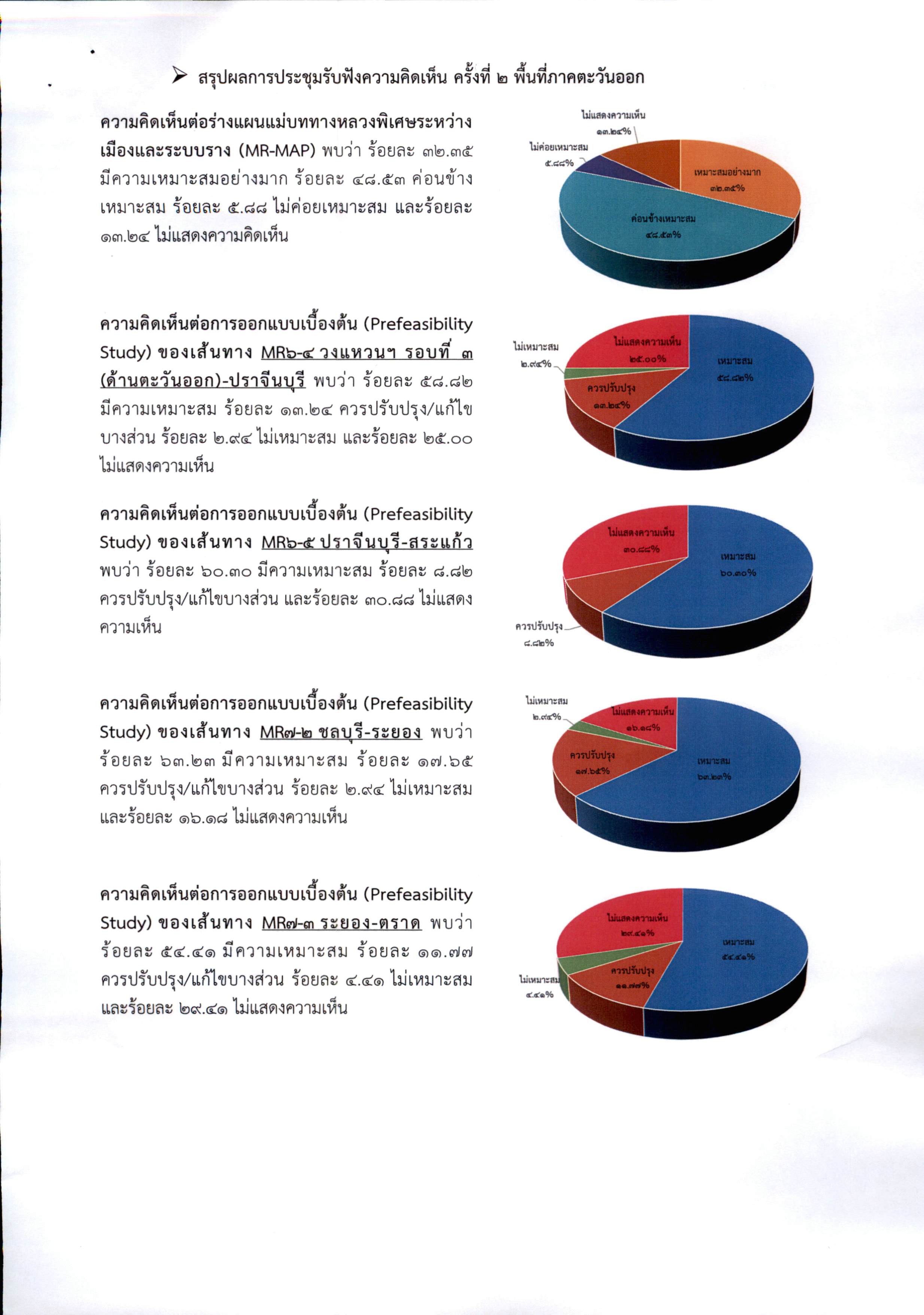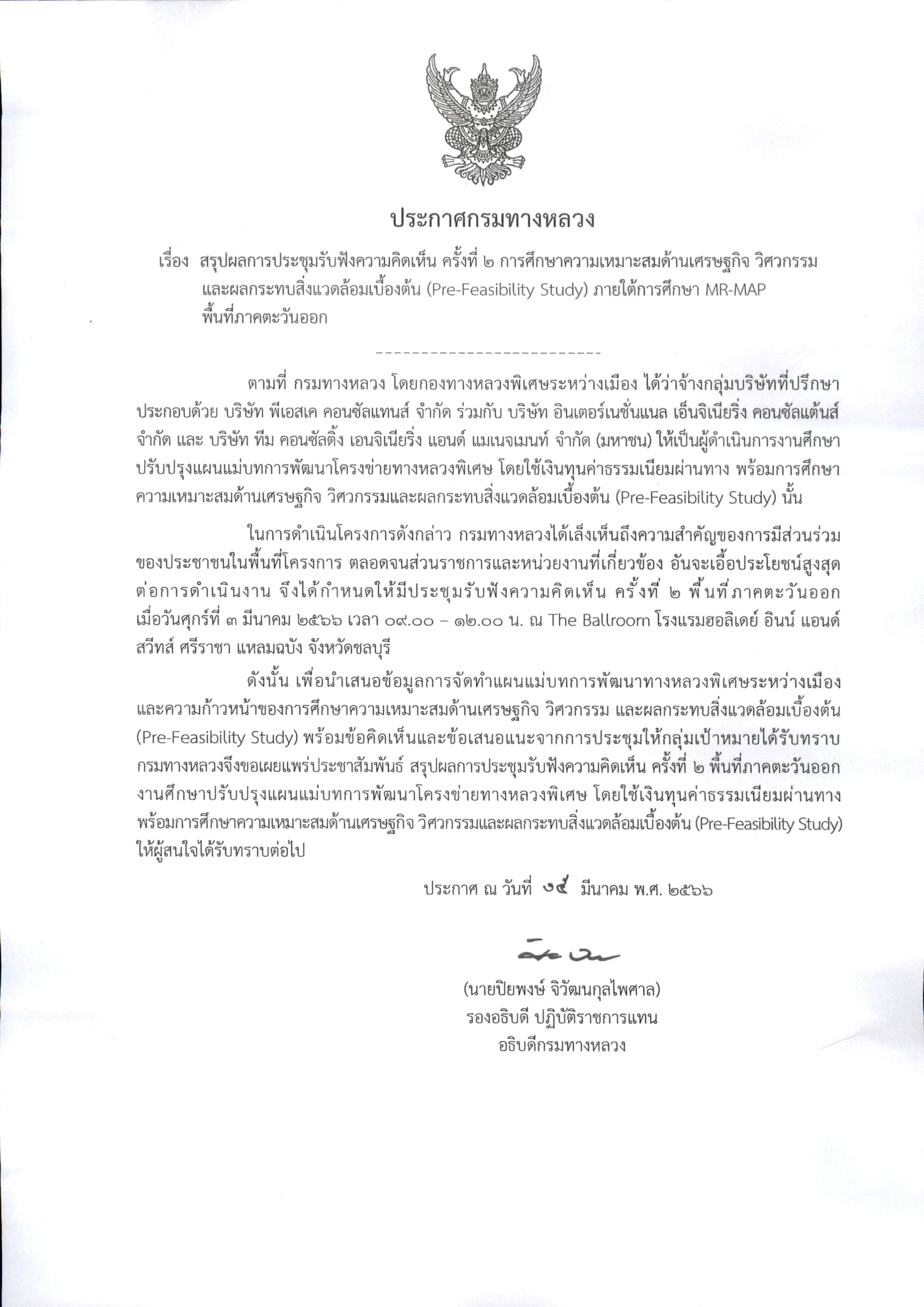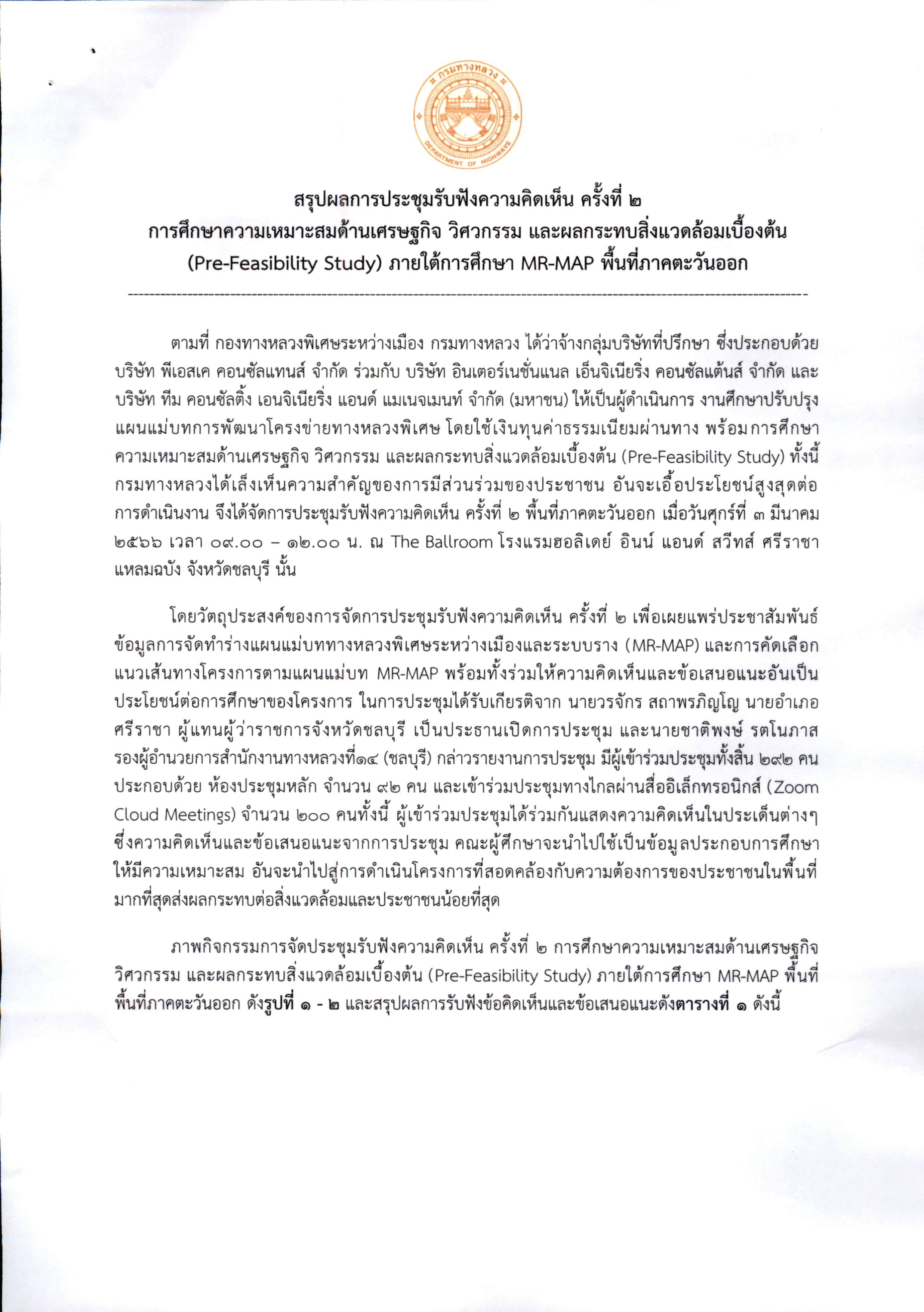 สรุปผลการประชุมรับฟังความคิดเห็น ครั้งที่ 2 การศึกษาความเหมาะสมด้านเศรษฐกิจ วิศวกรรม และผลกระทบสิ่งแวดล้อมเบื้องต้น (Pre-Feasibility Study) ภายใต้การศึกษา MR-MAP พื้นที่ภาคตะวันออก