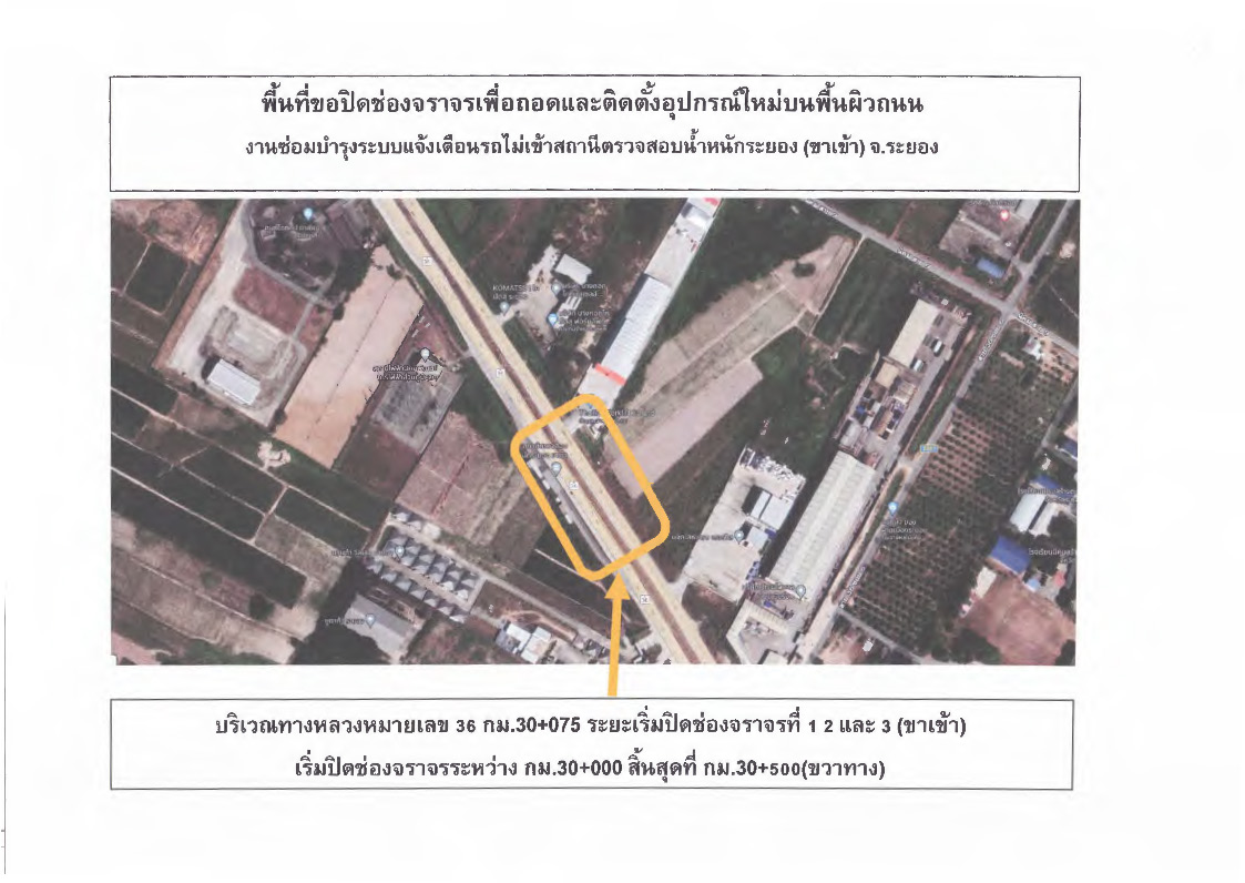 สำนักงานควบคุมน้ำหนักยานพาหนะ กรมทางหลวง ดำเนินการจ้างงานเพิ่มประสิทธิภาพระบบแจ้งเตือนรถไม่เข้าสถานีตรวจสอบน้ำหนักระยอง (ขาเข้า) โดยบริษัท ไอ-สมาร์ท 8 จำกัด เป็นผู้ดำเนินการ จะดำเนินการถอดอุปกรณ์และติดตั้งอุปกรณ์ใหม่บนพื้นผิวถนน และจะปิดการจราจรบริเวณสถานีตรวจสอบน้ำหนักระยอง (ขาเข้า) จ.ระยอง ในทางหลวงหมายเลข 36 ตอน มะขามคู่ - มาบข่า ช่วงระหว่าง กม.30+000 - กม.30+500 ด้านขวาทาง โดยจะดำเนินการปิดจราจร 3 ช่องจราจร ดังนี้