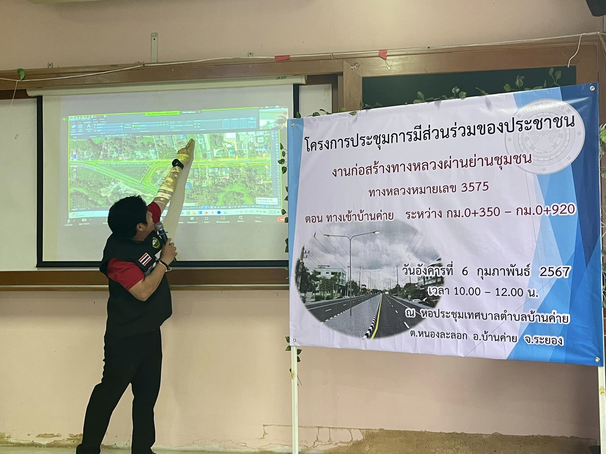 วันอังคารที่ 6 กุมภาพันธ์ 2567 เวลา 10.00 น. นายสุชาติ เชาวน์เสฏฐกุล ผู้อำนวยการแขวงทางหลวงระยอง? พร้อมเจ้าหน้าที่ จัดประชุมการมีส่วนร่วมของประชาชนเพื่อรับฟังความคิดเห็นฯ โครงการก่อสร้างทางหลวงผ่านย่านชุมชน ทางหลวงหมายเลข 3575 ตอน ทางเข้าบ้านค่าย ระหว่าง กม.0+350 - กม.0+920 โดยมี นายสุทธิพงศ์ ทองส่องแสง นายกเทศมนตรีตำบลบ้านค่าย เป็นประธานในพิธีเปิดการประชุมฯ ณ ห้องประชุมเทศบาลตำบลบ้านค่าย