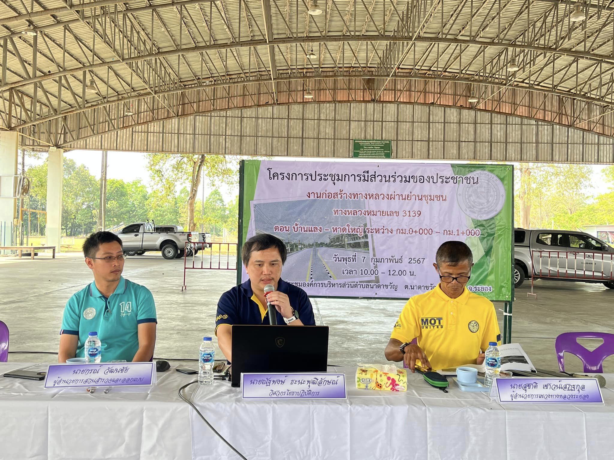 วันพุธที่ 7 กุมภาพันธ์ 2567 เวลา 10.00 น. นายสุชาติ เชาวน์เสฏฐกุล ผู้อำนวยการแขวงทางหลวงระยอง? พร้อมเจ้าหน้าที่ จัดประชุมการมีส่วนร่วมของประชาชนเพื่อรับฟังความคิดเห็นฯ โครงการก่อสร้างทางหลวงผ่านย่านชุมชน ทางหลวงหมายเลข 3139 ตอน บ้านแลง - หาดใหญ่ ระหว่าง กม.0+000 - กม.1+000 โดยมี นายอุทิศ ซื่อประเสริฐ นายกองค์การบริหารส่วนตำบลนาตาขวัญ เป็นประธานในพิธีเปิดการประชุมฯ ณ องค์การบริหารส่วนตำบลนาตาขวัญ ตำบลนาตาขวัญ อำเภอเมือง จังหวัดระยอง