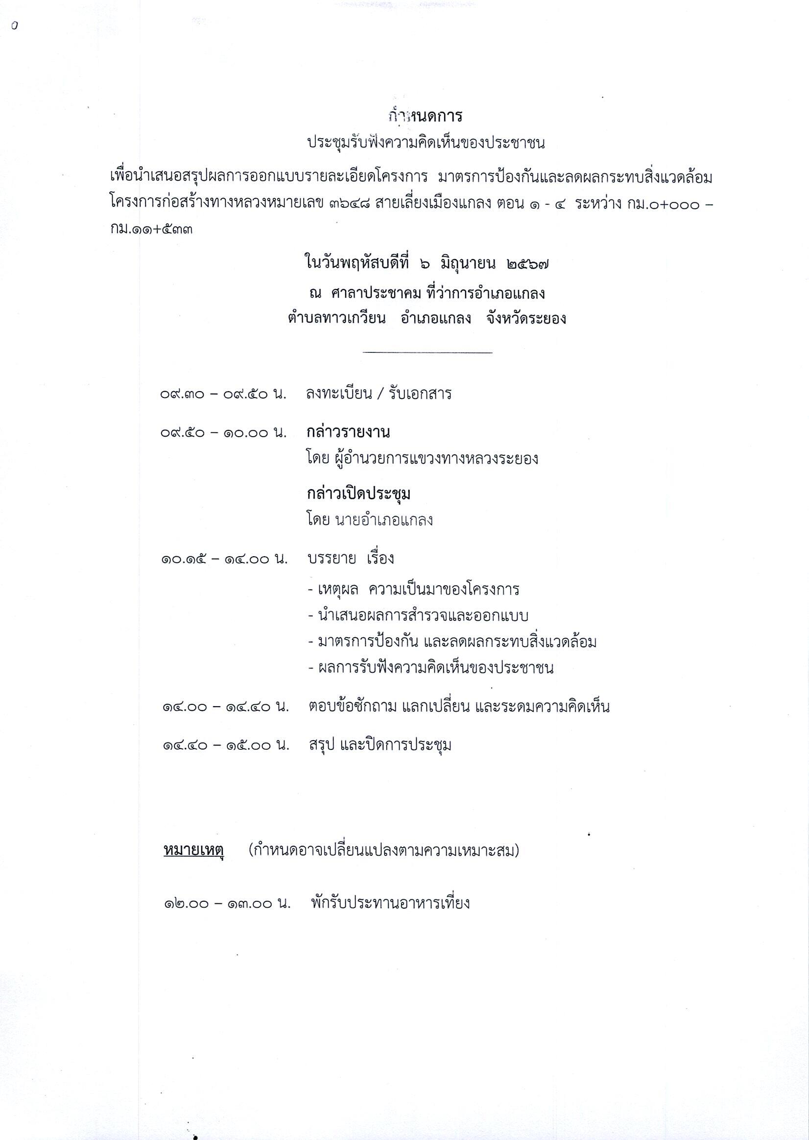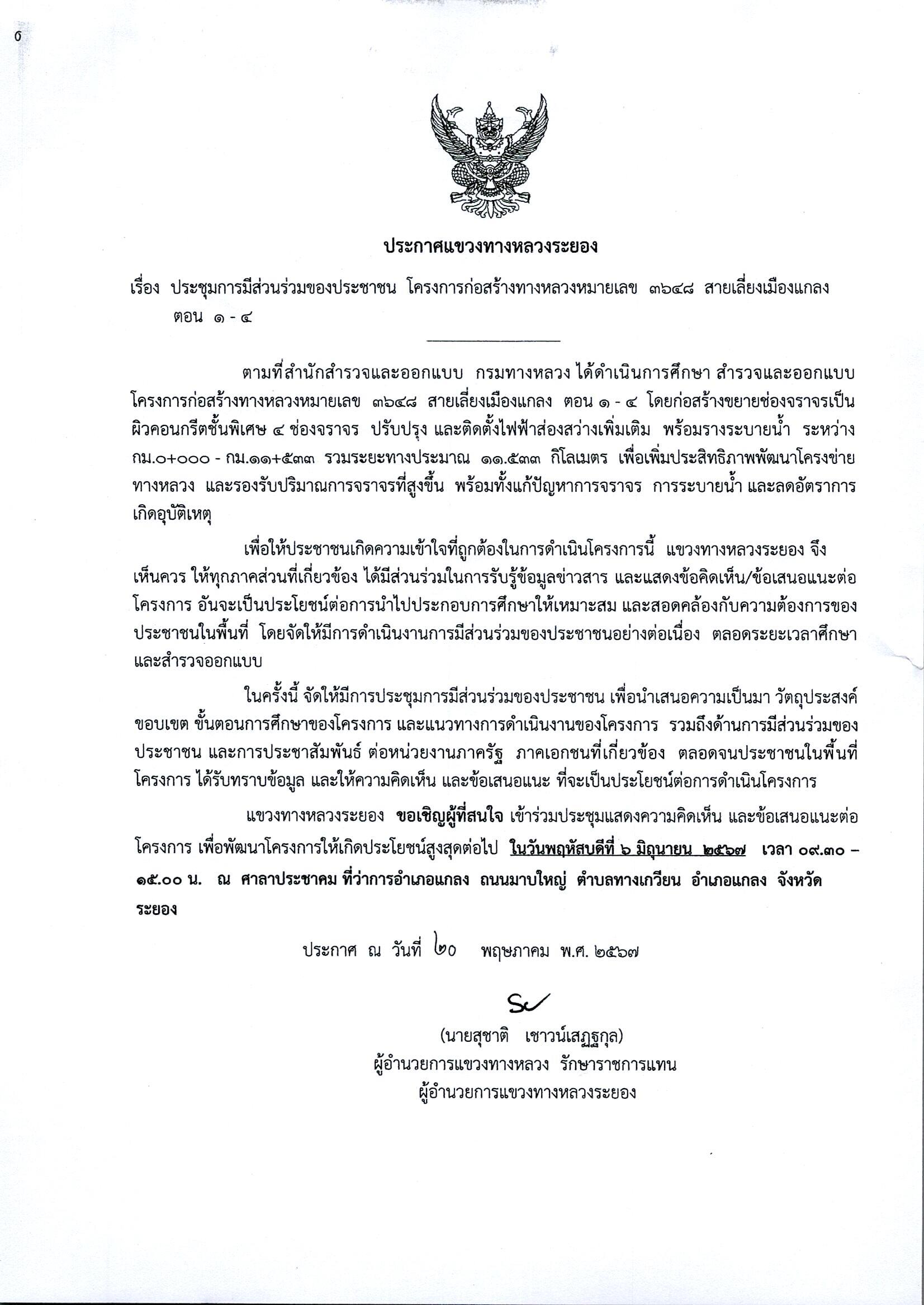 แขวงทางหลวงระยอง ขอเชิญผู้ที่สนใจ เข้าร่วมประชุมแสดงความคิดเห็น และข้อเสนอแนะต่อโครงการ เพื่อพัฒนาโครงการให้เกิดประโยชน์สูงสุดต่อไป ในวันพฤหัสบดีที่ 6 มิถุนายน 2567 เวลา 09.30 - 15.00 น. ณ ศาลาประชาคม ที่ว่าการอำเภอแกลง ถนนมาบใหญ่ ตำบลทางเกวียน อำเภอแกลง จังหวัดระยอง