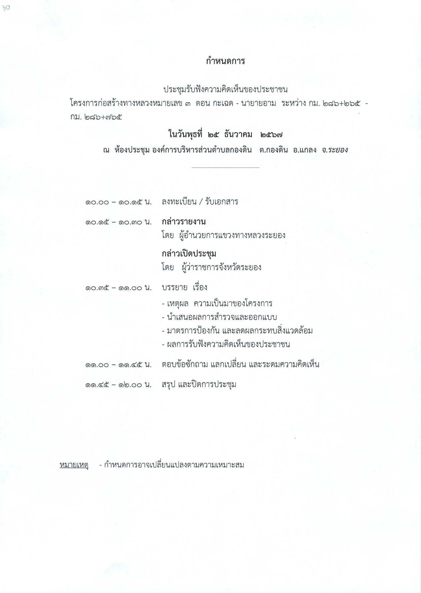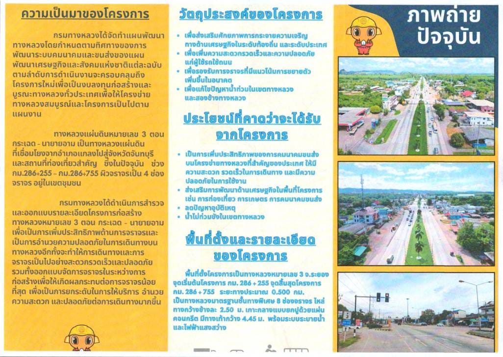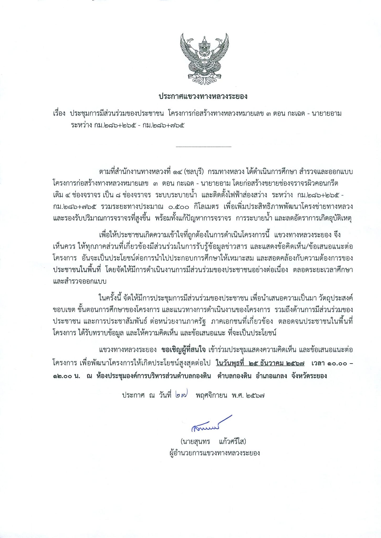 | ประกาศเรื่อง การประชุมการมีส่วนร่วมของประชาชน โครงการก่อสร้างทางหลวงหมายเลข 3 ตอน กระเฉด - นายายอาม ระหว่าง กม.286+265 - กม.286+765 แขวงทางหลวงระยองขอเชิญผู้ที่สนใจเข้าร่วมประชุมแสดงความคิดเห็นและข้อเสนอแนะต่อโครงการฯ ในวันพุธที่ 25 ธันวาคม 2567 เวลา 10.00-12.00 น. ณ ห้องประชุมองค์การบริหารส่วนตำบลกองดิน ตำบลกองดิน อำเภอแกลง จังหวัดระยอง | 241 | ดาวน์โหลด |