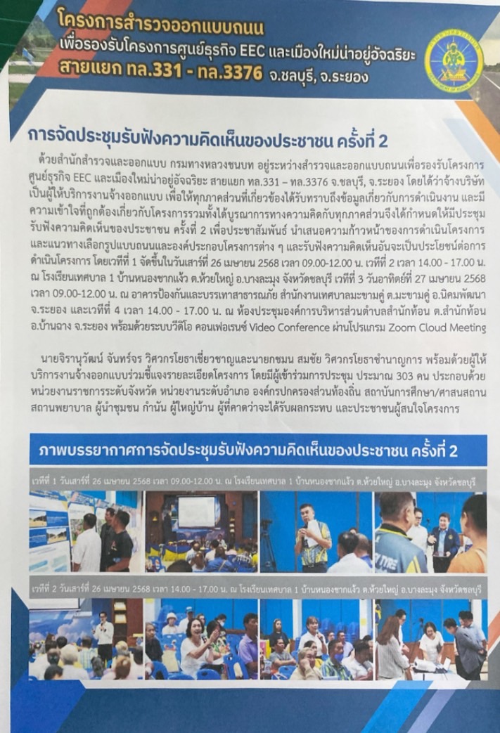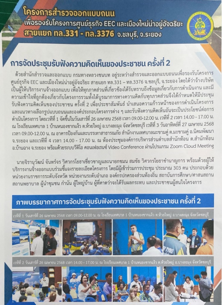 สรุปผลการประชุมรับฟังความคิดเห็นและการมีส่วนร่วมของประชาชนครั้งที่ 2 โครงการสำรวจออกแบบถนนเพื่อการรองรับโครงการศูนย์ธุรกิจ EEC และเมืองใหม่น่าอยู่อัจฉริยะสายแยก ทล.331 - ทล.3376 จังหวัดชลบุรี,ระยอง