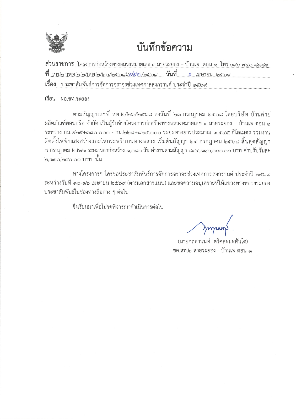 ข้อมูลข่าว : ประชาสัมพันธ์การจัดการจราจรช่วงเทศกาลสงกรานต์ ประจำปี 2569 (แขวงทางหลวงระยอง)