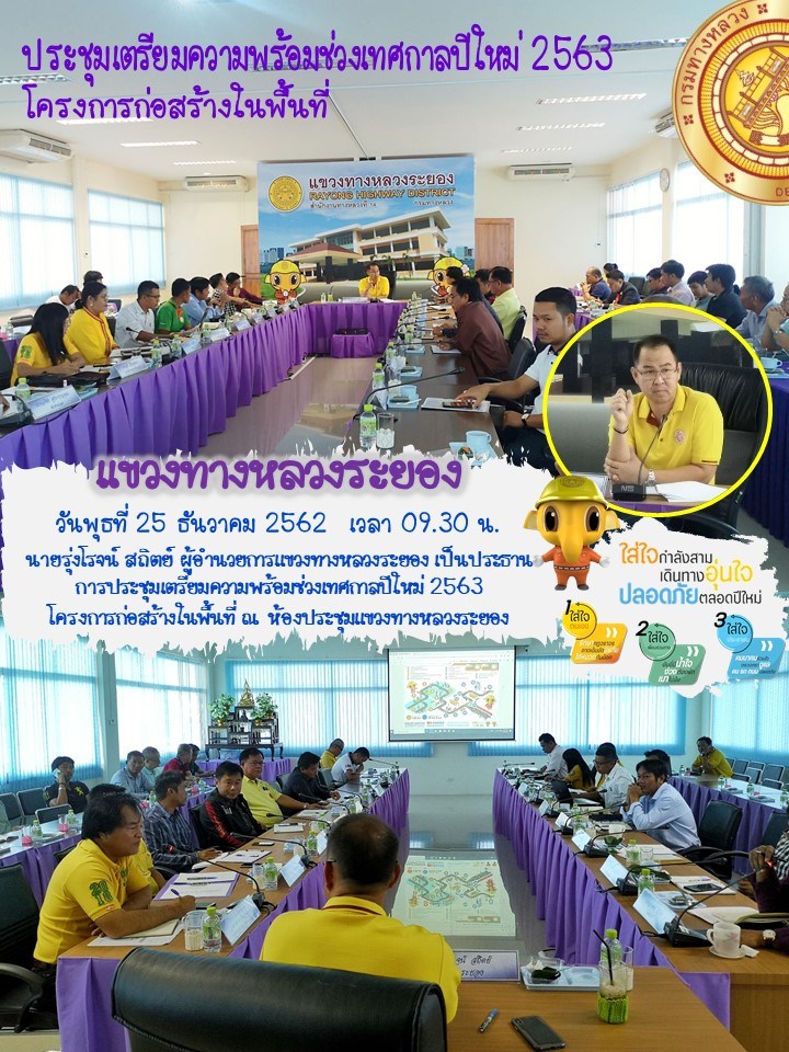 วันพุธที่ 25 ธันวาคม 2562 เวลา 09.30 น. นายรุ่งโรจน์ สถิตย์ ผู้อำนวยการแขวงทางหลวงระยอง เป็นประธานการประชุมเตรียมความพร้อมช่วงเทศกาลปีใหม่ 2563 โครงการก่อสร้างในพื้นที่ ณ ห้องประชุมแขวงทางหลวงระยอง #แขวงทางหลวงระยอง #กรมทางหลวง #สายด่วนกรมทางหลวง1586
