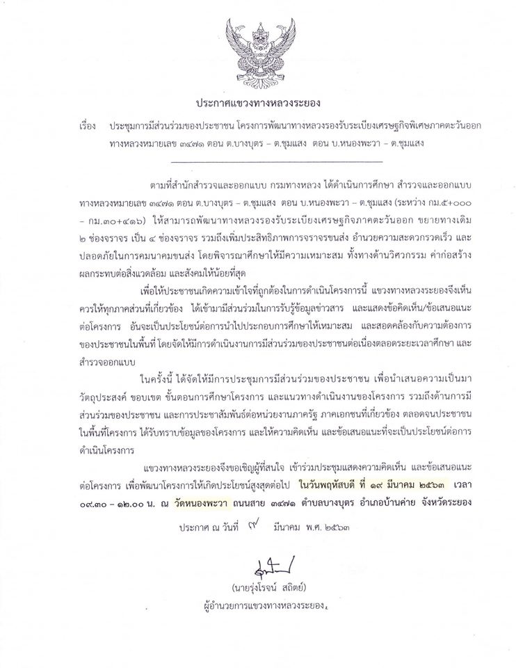 แขวงทางหลวงระยอง ขอเชิญผู้ที่สนใจ เข้าร่วมประชุมแสดงความคิดเห็น และข้อเสนอแนะต่อโครงการฯ เพื่อพัฒนาโครงการให้เกิดประโยชน์สูงสุดต่อไป ในวันพฤหัสบดีที่ 19 มีนาคม 2563 เวลา 09.30 - 12.00 น. ณ วัดหนองพะวา ถนนสาย 3471 ตำบลบางบุตร อำเภอบ้านค่าย จังหวัดระยอง