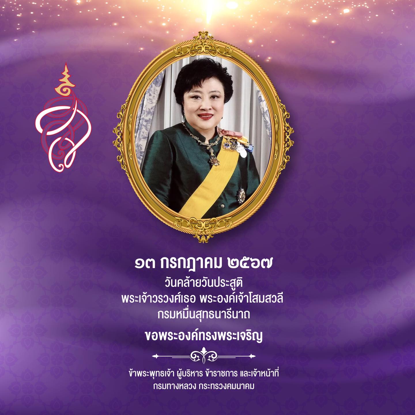 ขอพระองค์ทรงพระเจริญ เนื่องในโอกาสวันคล้ายวันประสูติ พระเจ้าวรวงศ์เธอ พระองค์เจ้าโสมสวลี กรมหมื่นสุทธนารีนาถ ๑๓ กรกฎาคม ๒๕๖๗ ควรมิควรแล้วแต่จะโปรดเกล้าโปรดกระหม่อม ข้าพระพุทธเจ้า ผู้บริหาร ข้าราชการ และเจ้าหน้าที่กรมทางหลวง กระทรวงคมนาคม