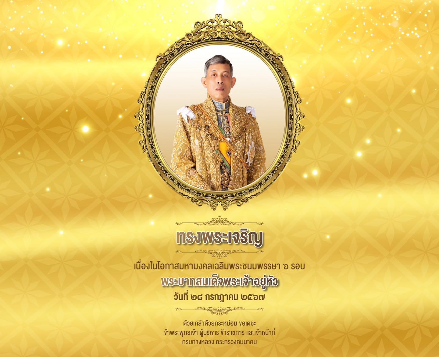 ขอพระองค์ทรงพระเจริญ เนื่องในโอกาสมหามงคลเฉลิมพระชนมพรรษา ๖ รอบ พระบาทสมเด็จพระเจ้าอยู่หัว ๒๘ กรกฎาคม ๒๕๖๗ ด้วยเกล้าด้วยกระหม่อม ขอเดชะ ข้าพระพุทธเจ้า ผู้บริหาร ข้าราชการ และเจ้าหน้าที่กรมทางหลวง กระทรวงคมนาคม
