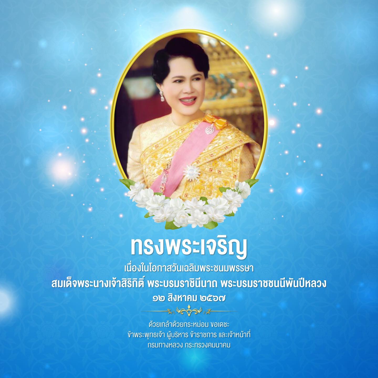ทรงพระเจริญ สมเด็จพระนางเจ้าสิริกิติ์ พระบรมราชินีนาถ พระบรมราชชนนีพันปีหลวง เนื่องในโอกาสวันเฉลิมพระชนมพรรษา วันที่ ๑๒ สิงหาคม ๒๕๖๗ ด้วยเกล้าด้วยกระหม่อม ขอเดชะ ข้าพระพุทธเจ้า คณะผู้บริหาร ข้าราชการ และเจ้าหน้าที่ กรมทางหลวง กระทรวงคมนาคม