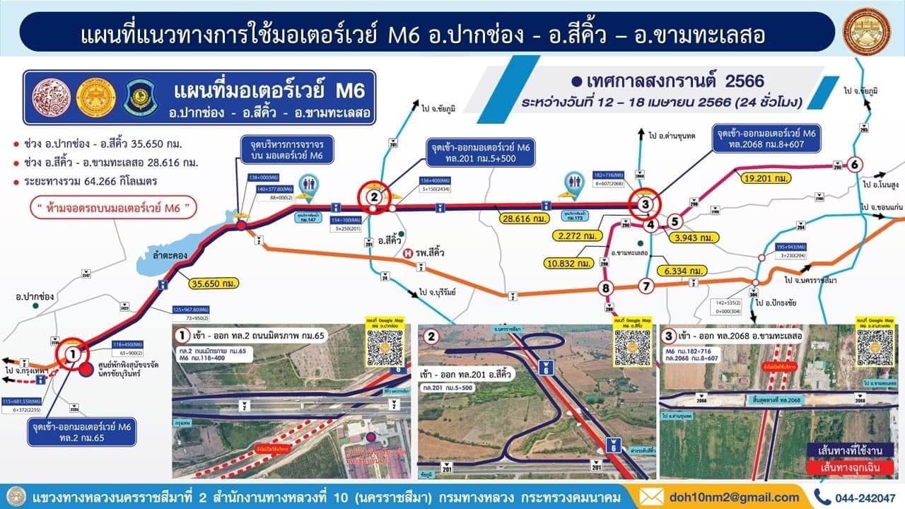 อธิบดีกรมทางหลวง กล่าวต่อไปว่า กรมทางหลวงจะเปิดให้บริการทางหลวงพิเศษหมายเลข 6 ช่วง ปากช่อง – สีคิ้ว – ขามทะเลสอ ระยะทาง 64 กิโลเมตร ตั้งแต่วันที่ 12 – 18 เมษายน 2566 ตลอด 24 ชั่วโมง (โดยจัดการจราจรแบบเดินรถทางเดียว ช่วงเดินทางขาออกจากกรุงเทพฯ วันที่ 12 – 14 เม.ย. 66 และช่วงเดินทางขาเข้ากรุงเทพฯ วันที่ 15 – 18 เม.ย. 66) เพื่อเพิ่มประสิทธิภาพในการเดินทางสู่ภาคตะวันออกเฉียงเหนือ โดยผู้ใช้ทางสามารถติดตามการรายงานสภาพจริงการจราจร Online แบบ Real time ผ่านแอพพลิเคชั่น M-Traffic (มอเตอร์เวย์) / Thailand Highway Traffic และเฟสบุ๊ค “ศูนย์บริหารจัดการจราจรและอุบัติเหตุกรมทางหลวง”