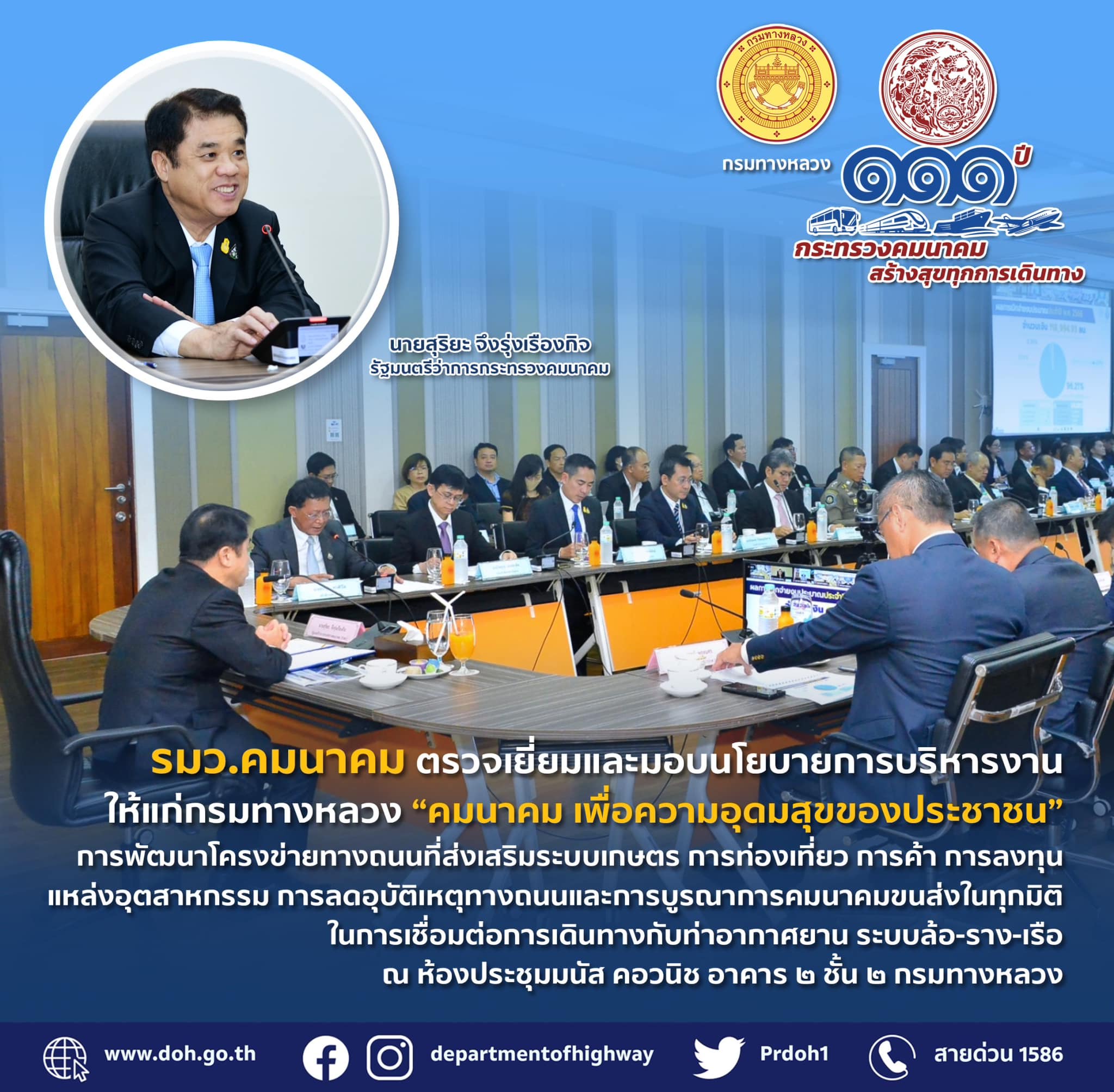 นายสุริยะ จึงรุ่งเรืองกิจ รัฐมนตรีว่าการกระทรวงคมนาคม เปิดเผยว่า วันนี้ได้มาตรวจเยี่ยมและมอบนโยบายการบริหารงานให้แก่กรมทางหลวง “คมนาคม เพื่อความอุดมสุขของประชาชน” เพื่อเป็นแนวทางการดำเนินงานในการขับเคลื่อนนโยบายของกระทรวงคมนาคมและยุทธศาสตร์สำคัญ ๆ ของประเทศ โดยในส่วนของภารกิจกรมทางหลวง ได้มอบนโยบายในด้านการพัฒนาโครงข่ายทางถนนที่ส่งเสริมระบบการเกษตร การท่องเที่ยว การค้า การลงทุนแหล่งอุตสาหกรรม การลดอุบัติเหตุทางถนน และการบูรณาการคมนาคมขนส่งในทุกมิติในการเชื่อมต่อการเดินทางกับ ท่าอากาศยานระบบ ล้อ-ราง-เรือ
