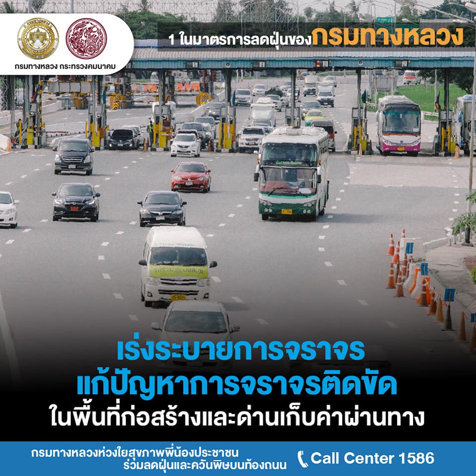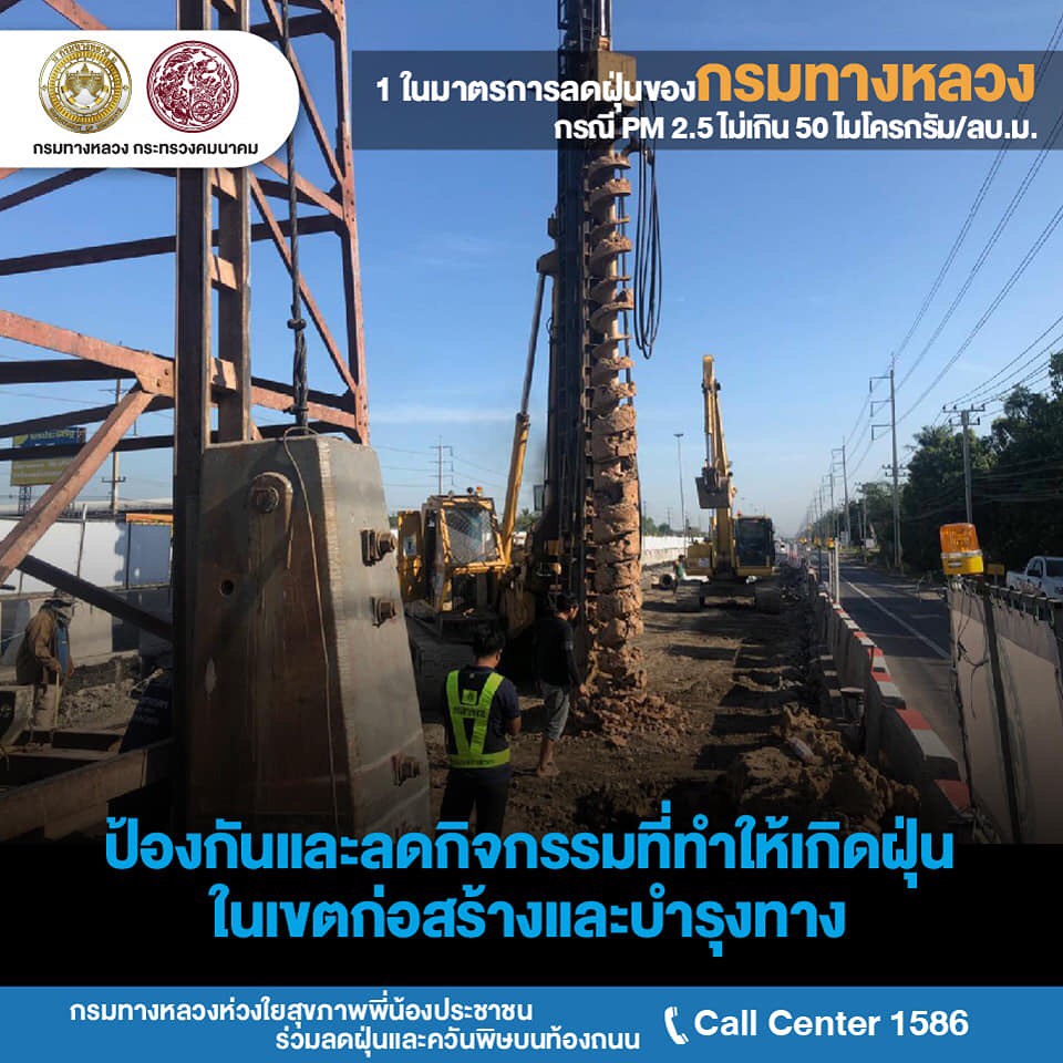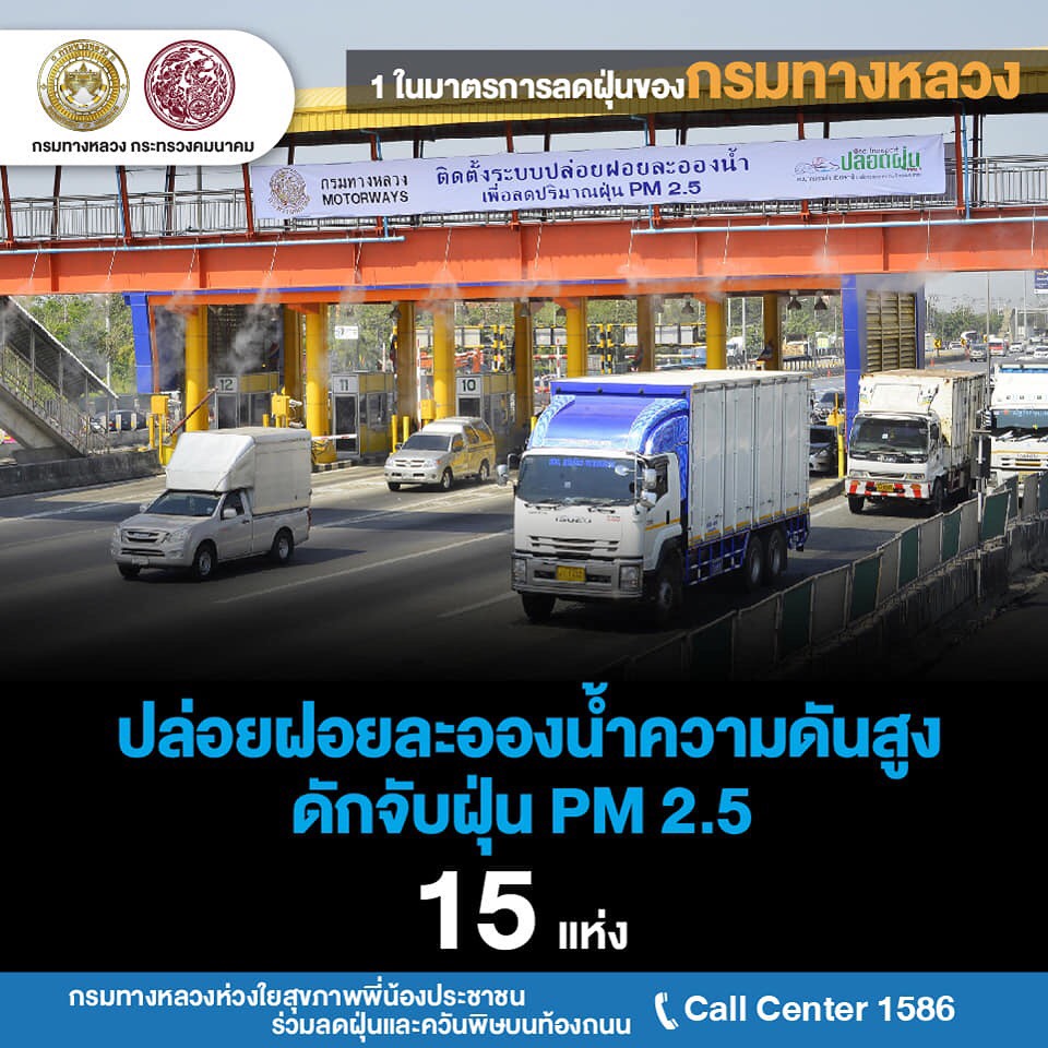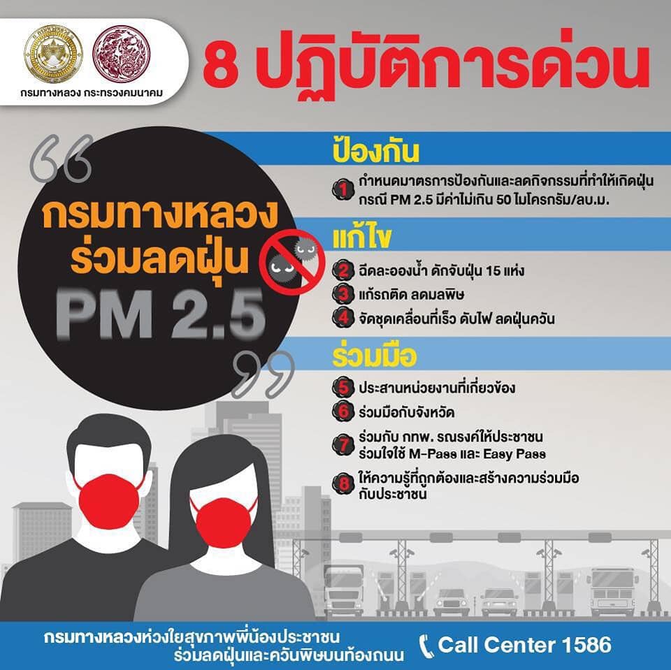 นายสราวุธ ทรงศิวิไล อธิบดีกรมทางหลวง (ทล.) เปิดเผยว่า สั่งการให้สำนักงานทางหลวงแขวงทางหลวง และหมวดทางหลวงทั่วประเทศ ดำเนินการตามแผนปฏิบัติการขับเคลื่อนวาระแห่งชาติของรัฐบาลในการแก้ไขปัญหามลพิษด้านฝุ่นละอองขนาดเล็ก หรือ PM 2.5 ด้วยการกำหนดมาตรการป้องกันแก้ไขปัญหาฝุ่นละอองใน 2 กรณี คือ กรณีที่ระดับปริมาณฝุ่น PM 2.5 มีค่าไม่เกิน 50 ไมโครกรัมต่อลูกบาศก์เมตร และกรณีเกิดสถานการณ์วิกฤตที่ระดับปริมาณฝุ่น PM 2.5 มีค่าเกิน 50 ไมโครกรัมต่อลูกบาศก์เมตรขึ้นไป กรณีที่ระดับปริมาณฝุ่น PM 2.5 มีค่าไม่เกิน 50 ไมโครกรัมต่อลูกบาศก์เมตร กรมทางหลวง จะดำเนินการมาตการ ดังนี้ ด้านงานก่อสร้างและบำรุงทาง มีการจำกัดพื้นที่หน้างานที่ก่อให้เกิดฝุ่นละอองให้น้อยที่สุดเท่าที่จำเป็น การเข้มงวดมาตรการป้องกันและลดฝุ่นละออง เช่น การปิดคลุมวัสดุก่อสร้างในการเก็บกองและ ขนย้าย การตรวจสอบสภาพเครื่องจักรก่อสร้างให้อยู่ในสภาพดี ห้ามใช้เครื่องจักรที่ก่อให้เกิดเขม่าควันดำ และการงดใช้น้ำมันเครื่องที่ใช้แล้วกับเครื่องจักรอุปกรณ์ เป็นต้น ส่วนขยะที่เกิดจากการก่อสร้างจะมีการจัดการอย่างเหมาะสม ห้ามเผาขยะโดยเด็ดขาด โดยพิจารณาวิธีการก่อสร้างที่ใช้การเผาไหม้เชื้อเพลิงน้อย เช่น warm mix asphalt การทำความสะอาด เศษฝุ่น เศษวัสดุที่สะสมบริเวณขอบทางและเกาะกลางอย่างสม่ำเสมอ รวมทั้งบูรณาการการทำงานร่วมกับจังหวัดทั่วประเทศในการลดการเกิดฝุ่นควัน และการอำนวยความสะดวกต่อการจราจรบนถนนบริเวณพื้นที่ก่อสร้าง เพื่อไม่ให้เกิดการจราจรติดขัดจากการก่อสร้างและบำรุงทาง ด้านงานการให้บริการผู้ใช้ทางและบริหารจัดการจราจรบนสายทาง จะประสานความร่วมมือระหว่างตำรวจทางหลวงและหน่วยงานที่เกี่ยวข้อง เช่น กรมควบคุมมลพิษในการตรวจจับรถยนต์ที่มีเขม่าควันดำ และเข้มงวดไม่ให้มีการจอดรถในพื้นที่ผิวถนนที่มีการจราจรแออัด จัดการจราจรให้ลื่นไหลลด การติดขัด รวมทั้งการบำรุงรักษาต้นไม้ริมทางหลวงให้อยู่ในสภาพดี เพื่อช่วยจับฝุ่นละอองจากถนน และเฝ้าระวังการเกิดปัญหาไฟป่าโดยการจัดชุดเคลื่อนที่เร็วพร้อมอุปกรณ์ในการป้องกันและควบคุม ด้านงานสำนักงาน ด้วยการลดการเดินทางของบุคลากร พิจารณาใช้เทคโนโลยีในการทำงานที่ช่วยลดการเดินทาง ลดการใช้ยานพาหนะส่วนตัว โดยเปลี่ยนการขนส่งสาธารณะโดยเฉพาะรถไฟฟ้า ตลอดจน การใช้รถยนต์ร่วมกัน (Carpool) สำหรับการเดินทางเส้นทางเดียวกัน นอกจากนั้นยังมีการจัดการขยะอย่างเหมาะสมโดยใช้วิธีการห้ามเผาโดยเด็ดขาด และรณรงค์ให้บุคลากรประหยัดพลังงานในสำ
